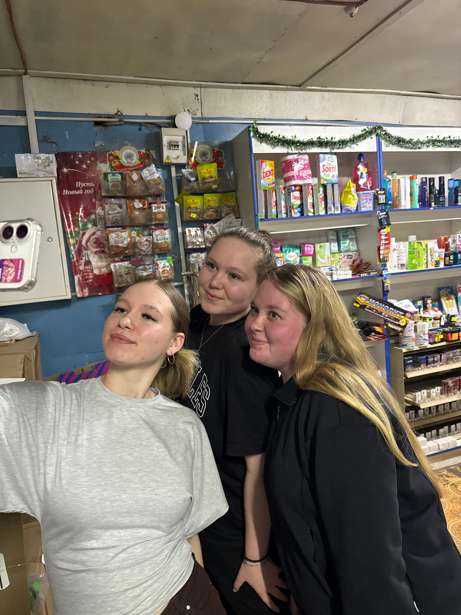 Three girls are posing for a selfie in what appears to be a small convenience store. The store has shelves stocked with various goods, including food items and household products. A Christmas garland…read more