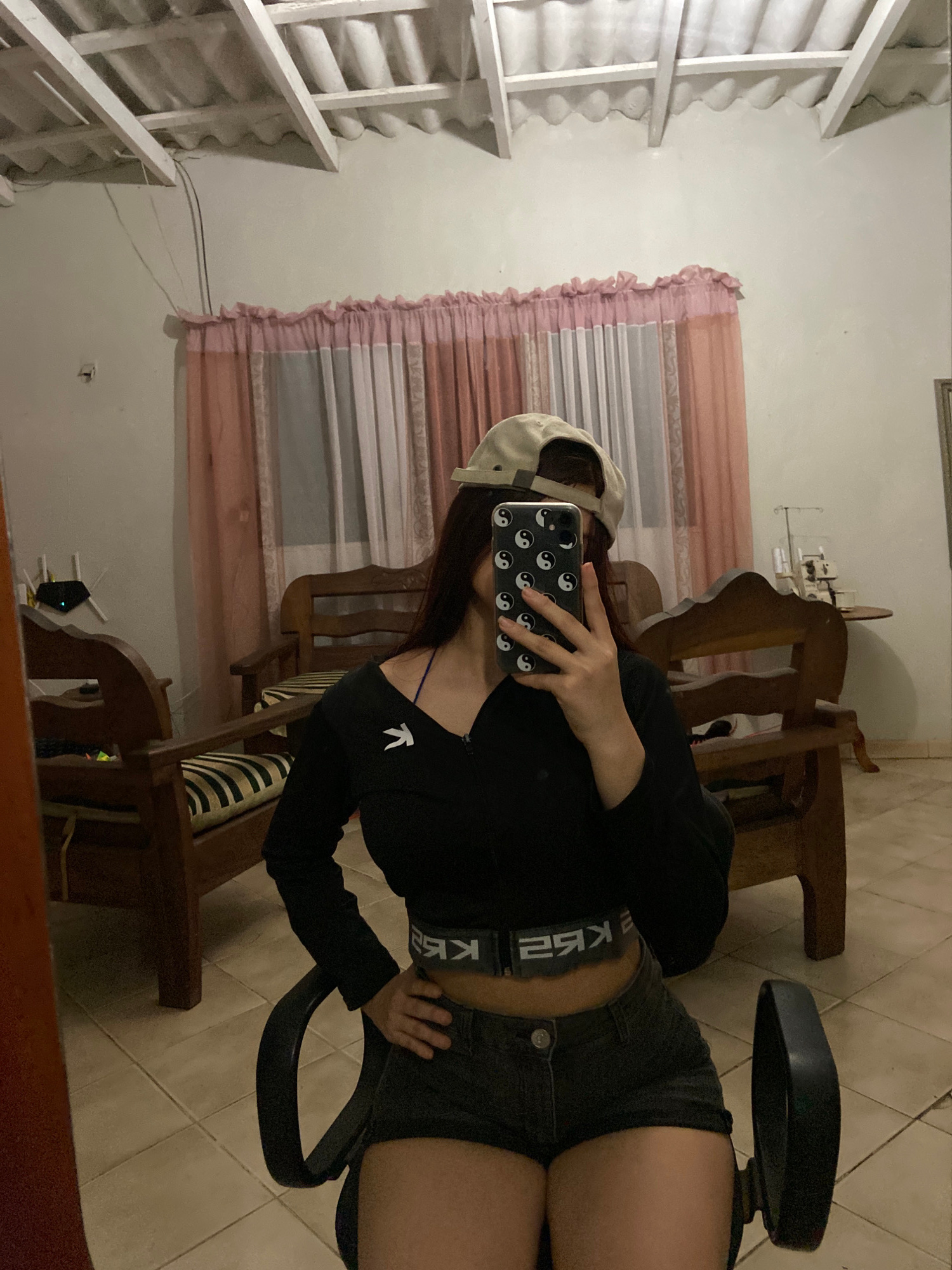 A person is sitting on a rolling office chair indoors, facing away from the camera. They are taking a picture of themselves in a mirror with their phone. The person is wearing a beige cap, a black lon…read more