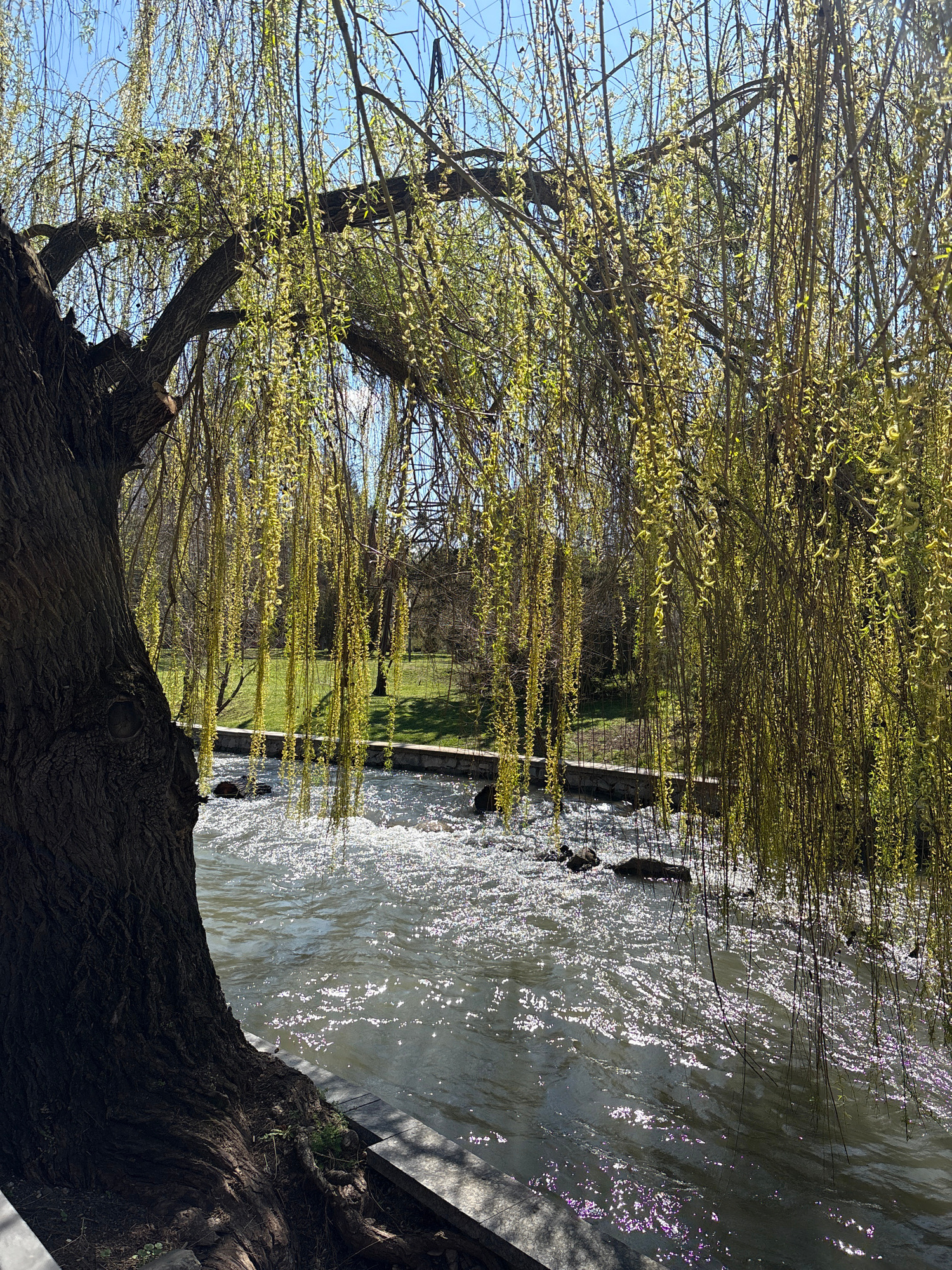The image depicts a river scene in Simferopol, Ukraine. A large tree with delicate, light green foliage dominates the left side of the frame, its branches hanging over the water. The tree's trunk is d…read more