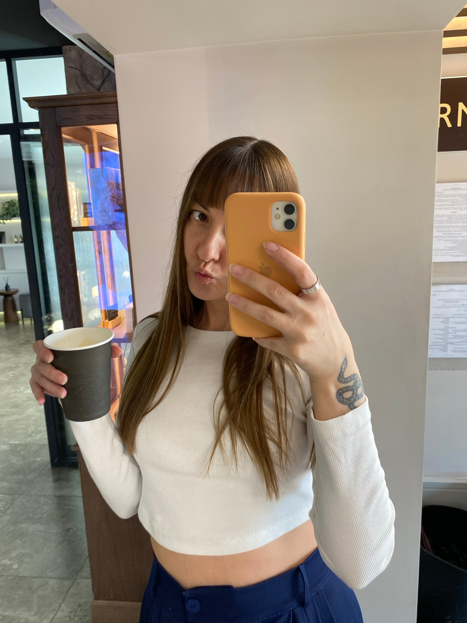 A person is taking a selfie while holding a cup. The person has long brown hair, is wearing a white long-sleeved crop top, and blue pants. A silver ring is on one of their fingers, and a snake tattoo…read more
