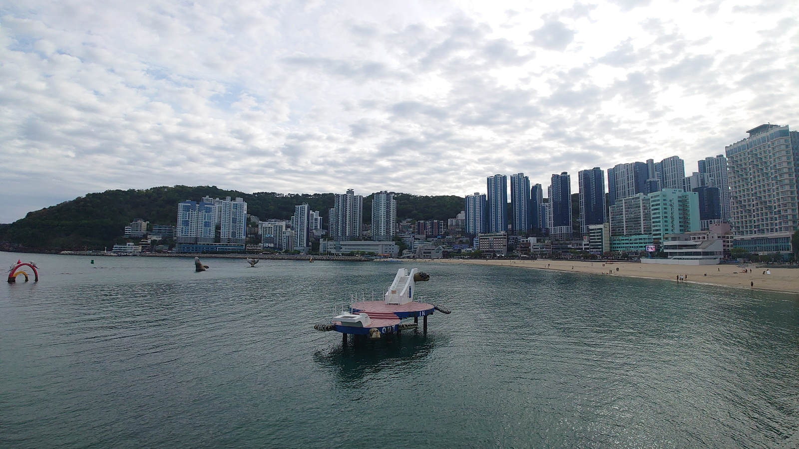 The image shows Haeundae Beach in Busan, South Korea, on a cloudy day. The beach is visible in the background with several high-rise buildings lining the coast. People are sparsely scattered along the…read more