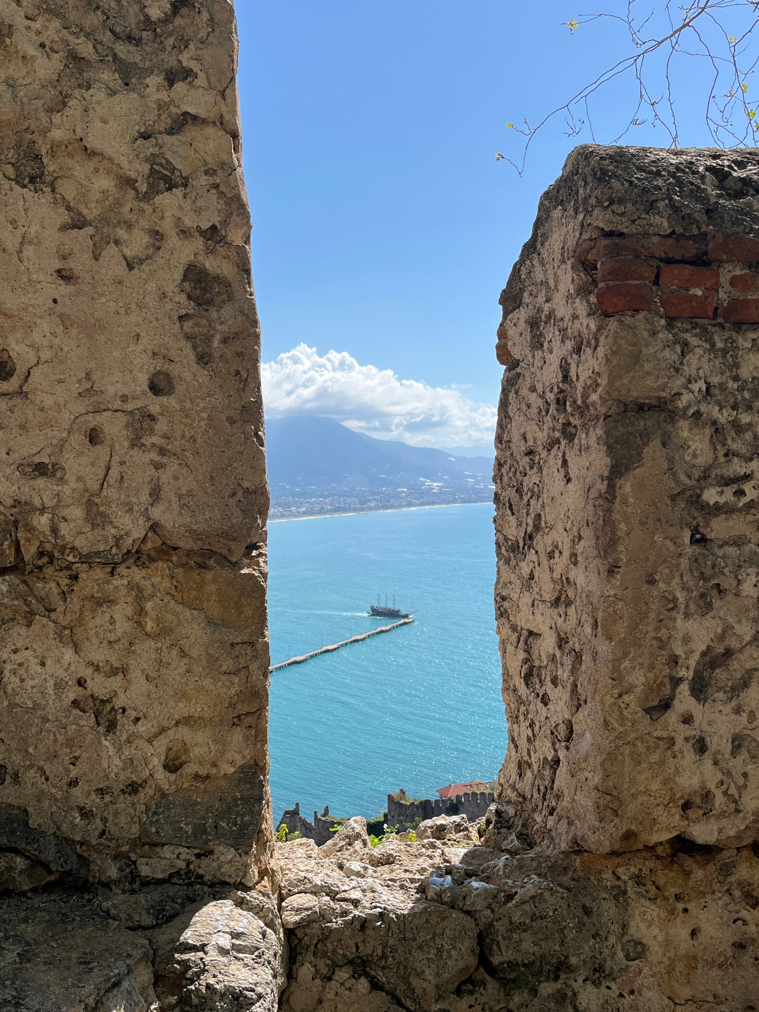 The image shows a view of the Mediterranean Sea and coastline in Alanya, Turkey, framed by an opening in an old stone wall. The wall is composed of rough, weathered stones and some exposed bricks. The…read more