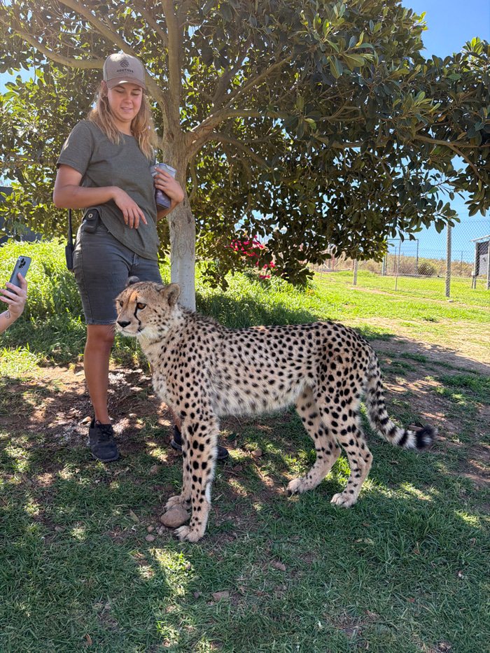 This image depicts an outdoor scene at a facility in Theewaterskloof Nu, South Africa, featuring a woman and a cheetah standing under a large, leafy tree. The woman, with blonde hair, wears a beige ba…read more