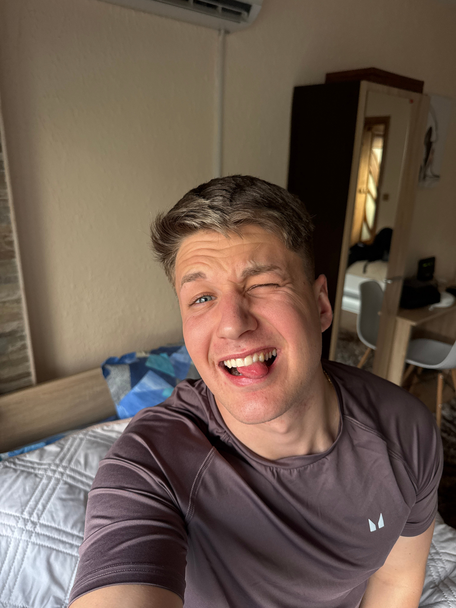A man is taking a selfie indoors. He is making a funny face, winking one eye and sticking his tongue out. He is wearing a dark purple shirt and appears to be lying on a bed with gray and white bedding…read more