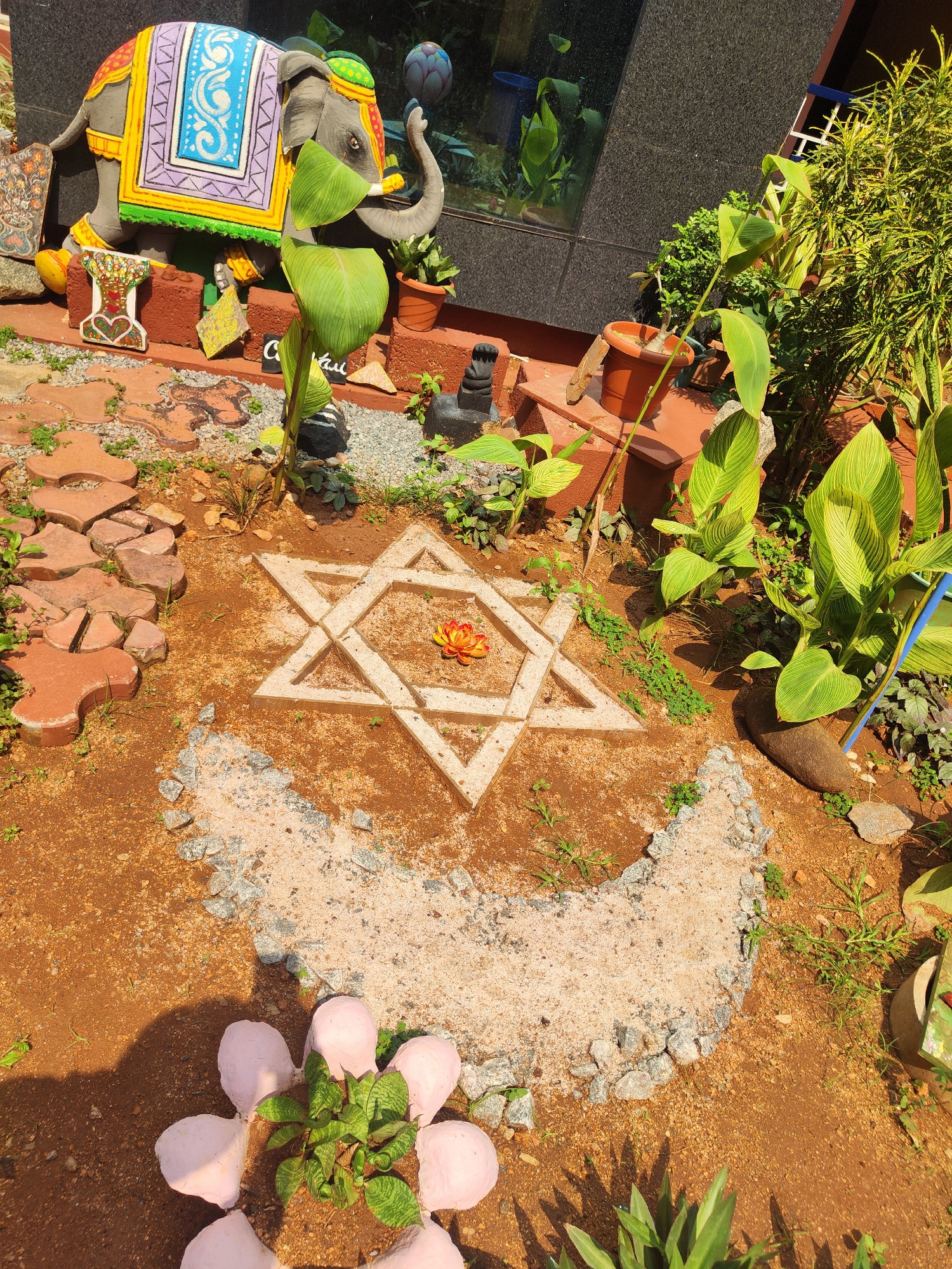 The image depicts a garden scene, possibly a private residence, in an unknown city and region. The ground is covered in reddish-brown soil. Centered in the image is a star-shaped design. It is constr…read more