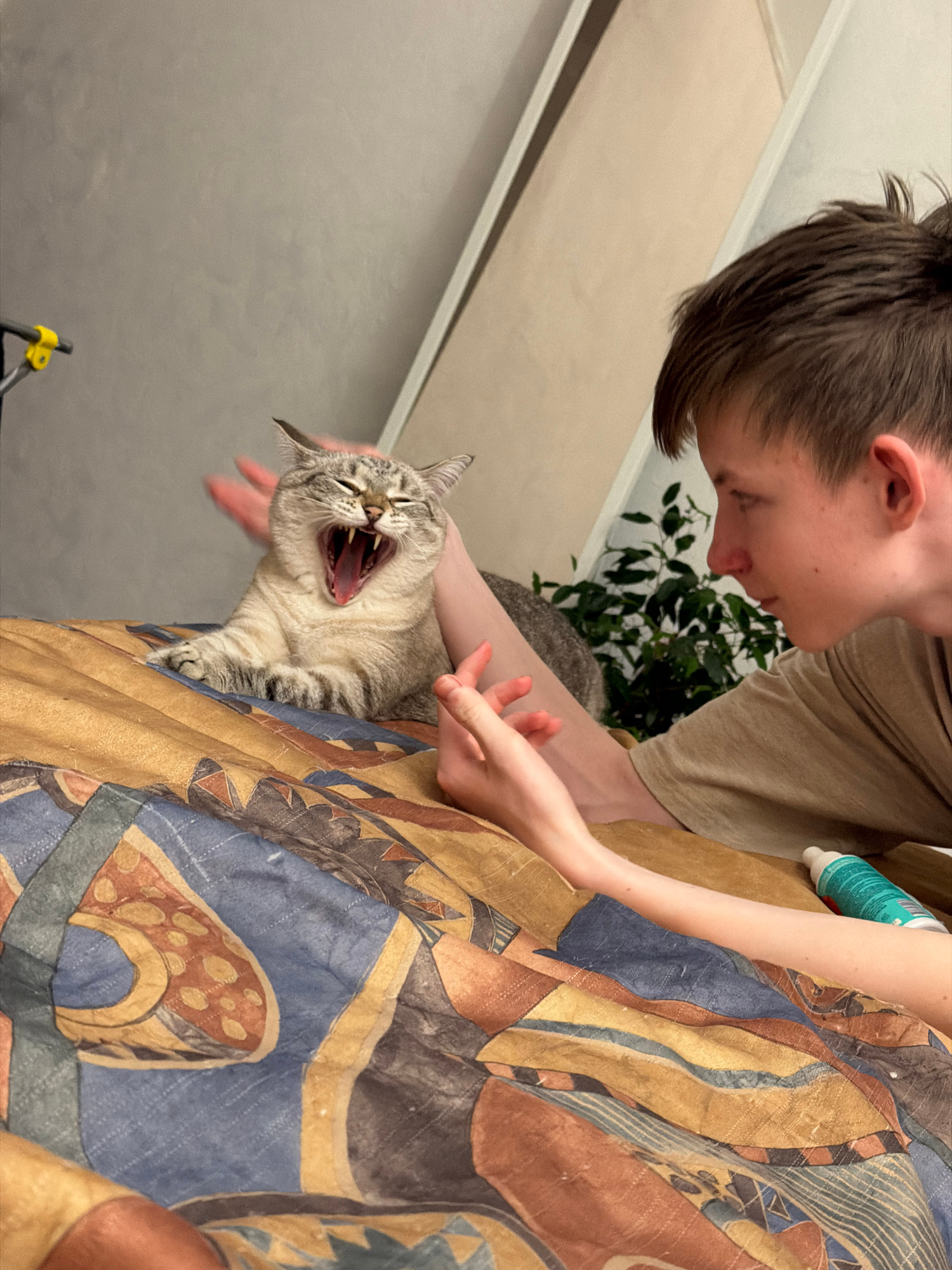 The image, taken in Perm, Russia, captures an intimate indoor scene from a low-angle perspective. The primary subjects are a young person and a cat, situated within a domestic setting. The person, a…read more