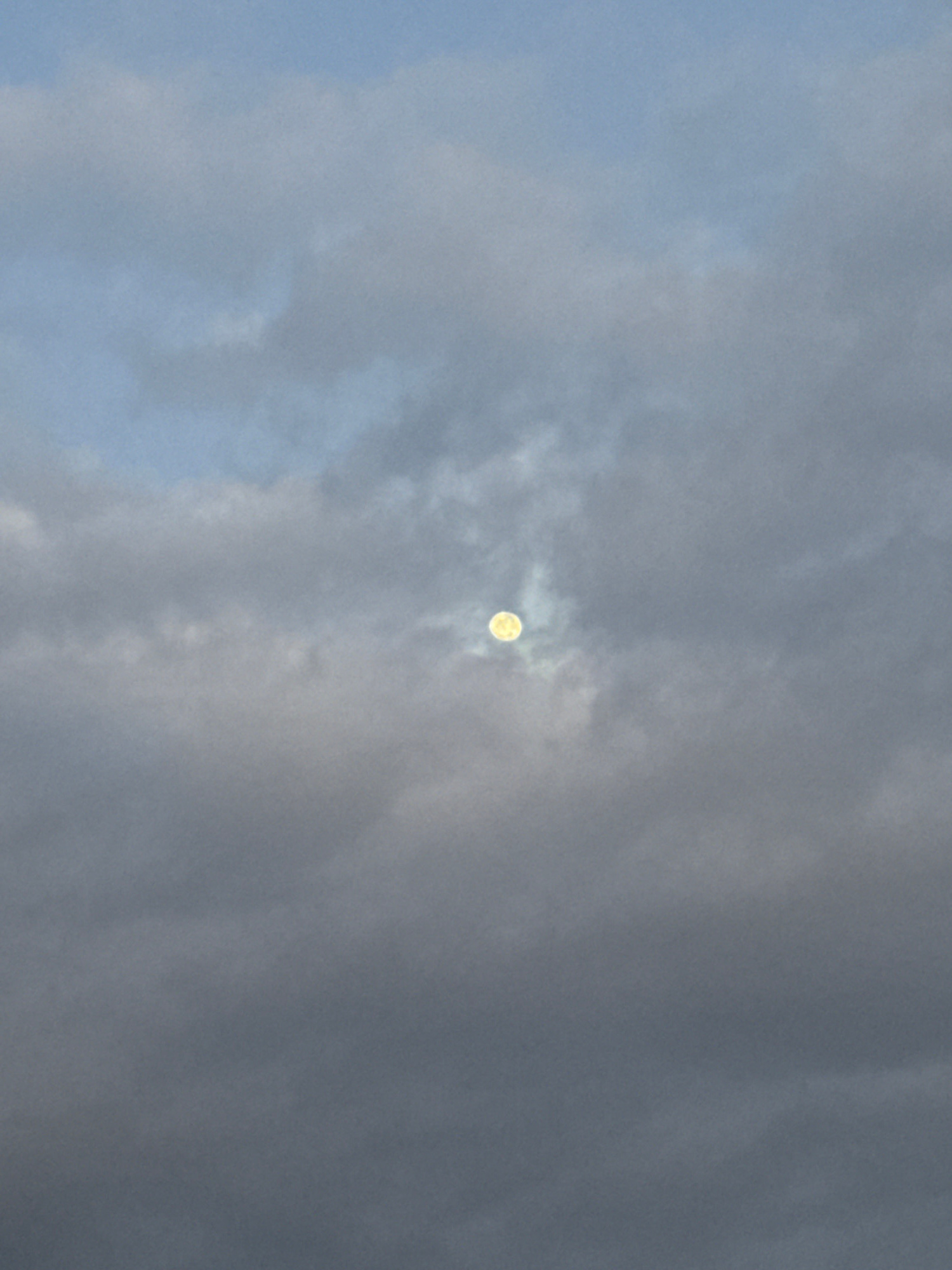 The image depicts a view of the daytime sky, heavily overcast with dark, gray clouds. A bright, circular object, likely the sun or moon, is visible through a thinner patch of clouds near the center of…read more
