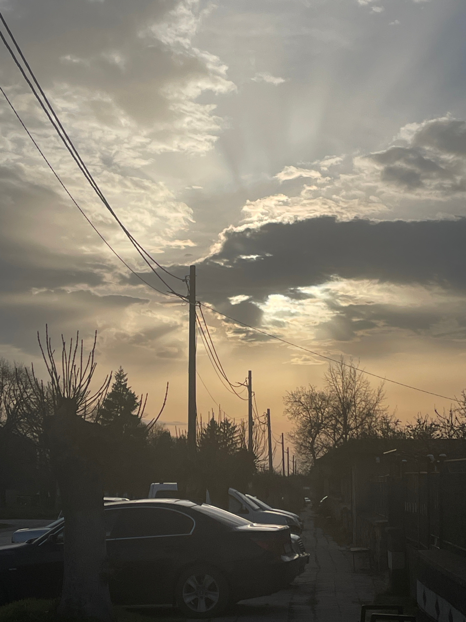 The image depicts a street scene in Aprilovo, Bulgaria, under a cloudy sky with visible sun rays. A dark-colored car is parked on the right side of the frame. Electrical poles and wires are visible, e…read more