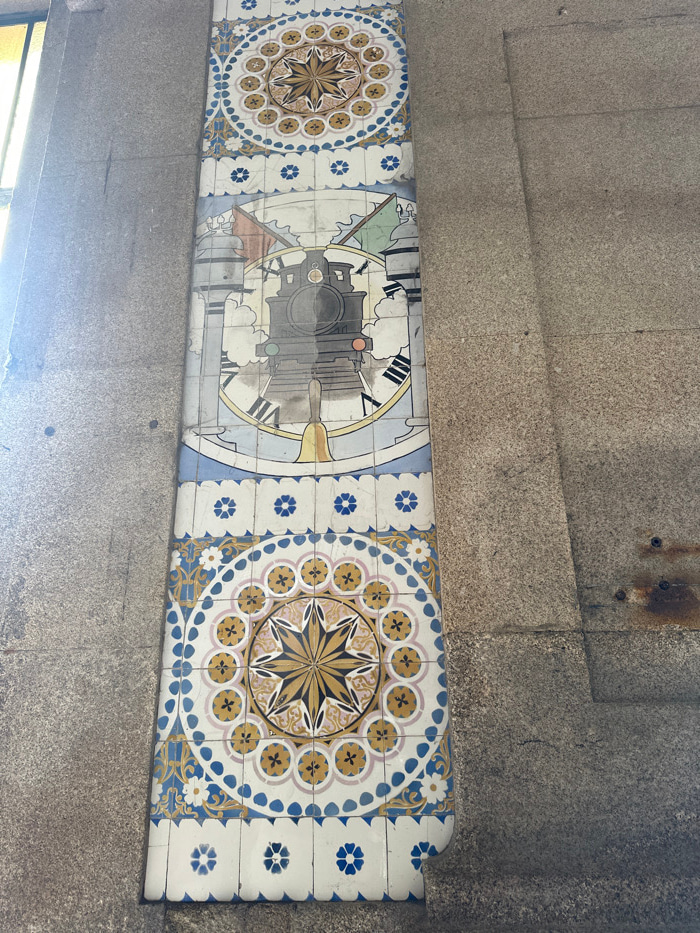 The image displays a vertical *azulejo* tile panel installed on a rough-hewn light-grey granite wall within the São Bento Railway Station in Porto, Portugal. The central portion of the tile panel feat…read more