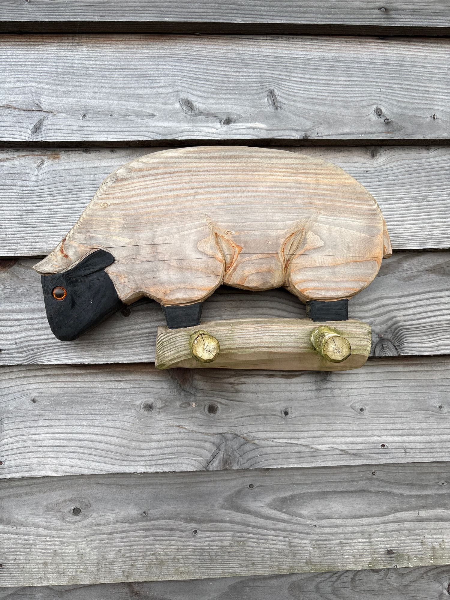 A close-up shot depicts a wooden gate latch, shaped like a goose head with a black beak and a cylindrical latch mechanism. The latch is mounted on weathered gray wooden planks. The scene offers no oth…read more