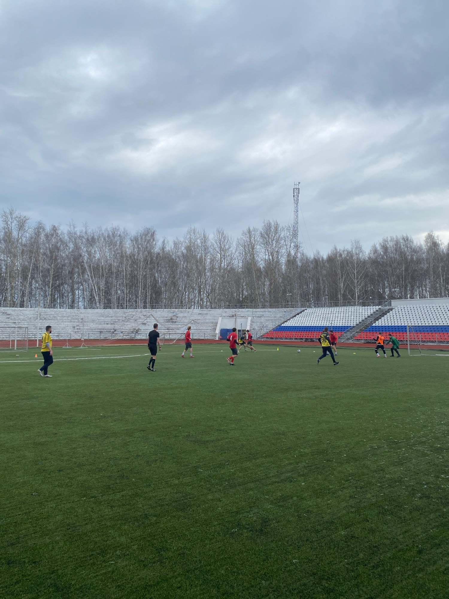 The image shows a soccer field in Chaikovsky, Russia, with a row of bleachers to the left and a row of bare trees behind them. A metal tower can be seen near the bleachers. There are several people on…read more
