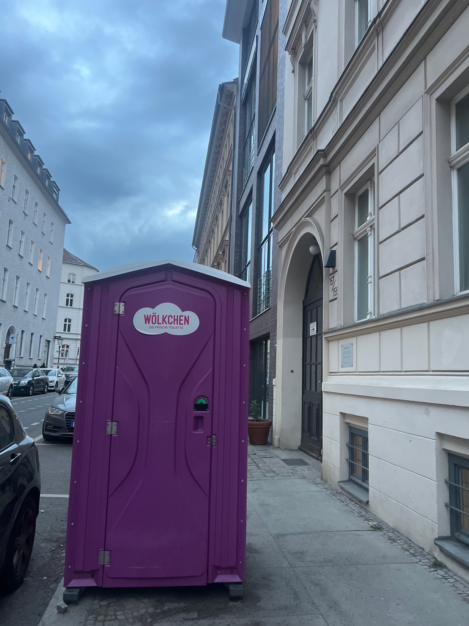 The image displays an urban street scene in Berlin, Germany, with a prominent purple portable toilet positioned horizontally across the lower central portion of the frame. The toilet's side, facing th…read more