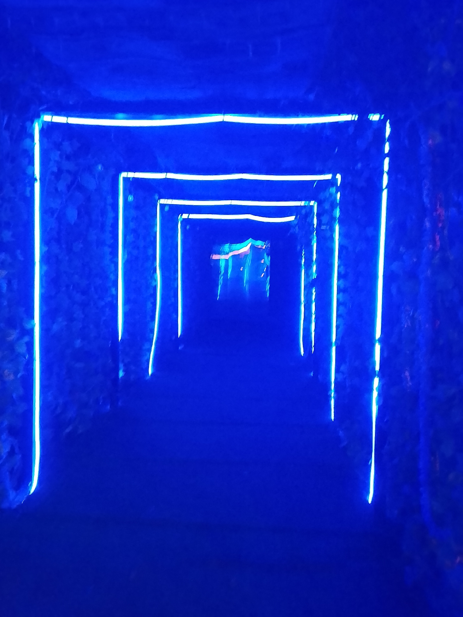 The image depicts a dark passageway in Rido, Nigeria, illuminated by a series of rectangular blue neon light frames decreasing in size into the distance. The walls of the passageway appear to be cover…read more