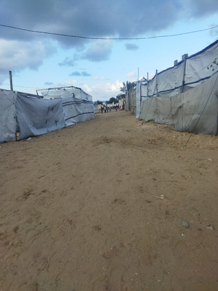 A dirt road leads between makeshift dwellings covered in white material. Some people are walking further down the road. The structures are supported by poles and ropes, suggesting a temporary or infor…read more