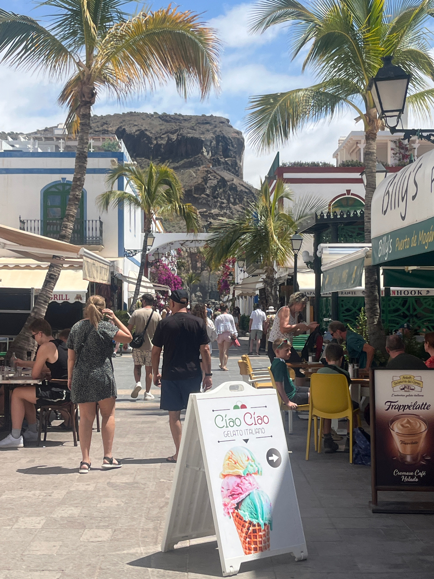 The image shows a sun-drenched street scene in Playa De Mogán, Spain, with a variety of elements: **Environment:** Palm trees dominate the foreground, framing the scene and adding a tropical feel. A…read more