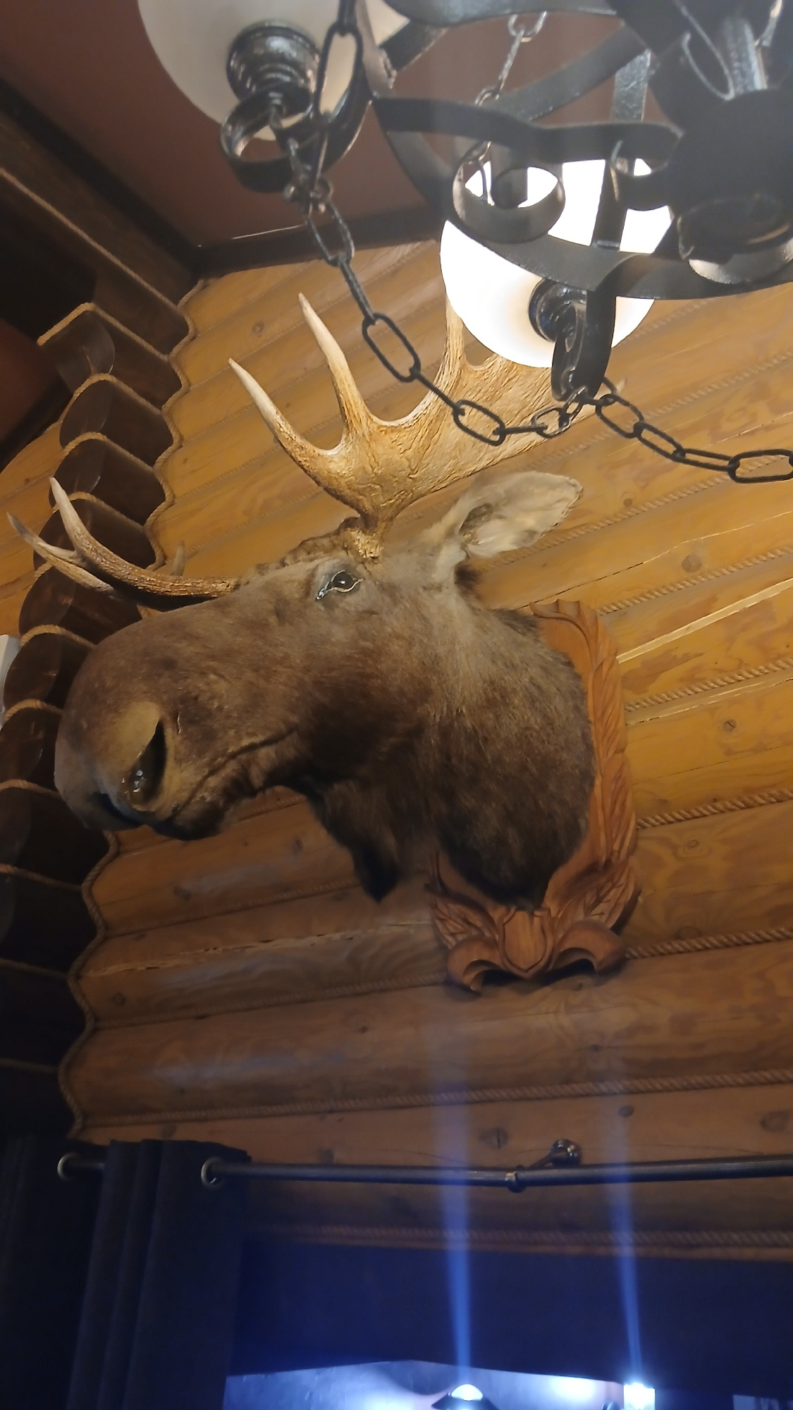 A low-angle shot shows a taxidermied moose head mounted on a wood-paneled wall, positioned near a metal chandelier with light bulbs. The moose head has antlers and a carved wood backing. The backgroun…read more