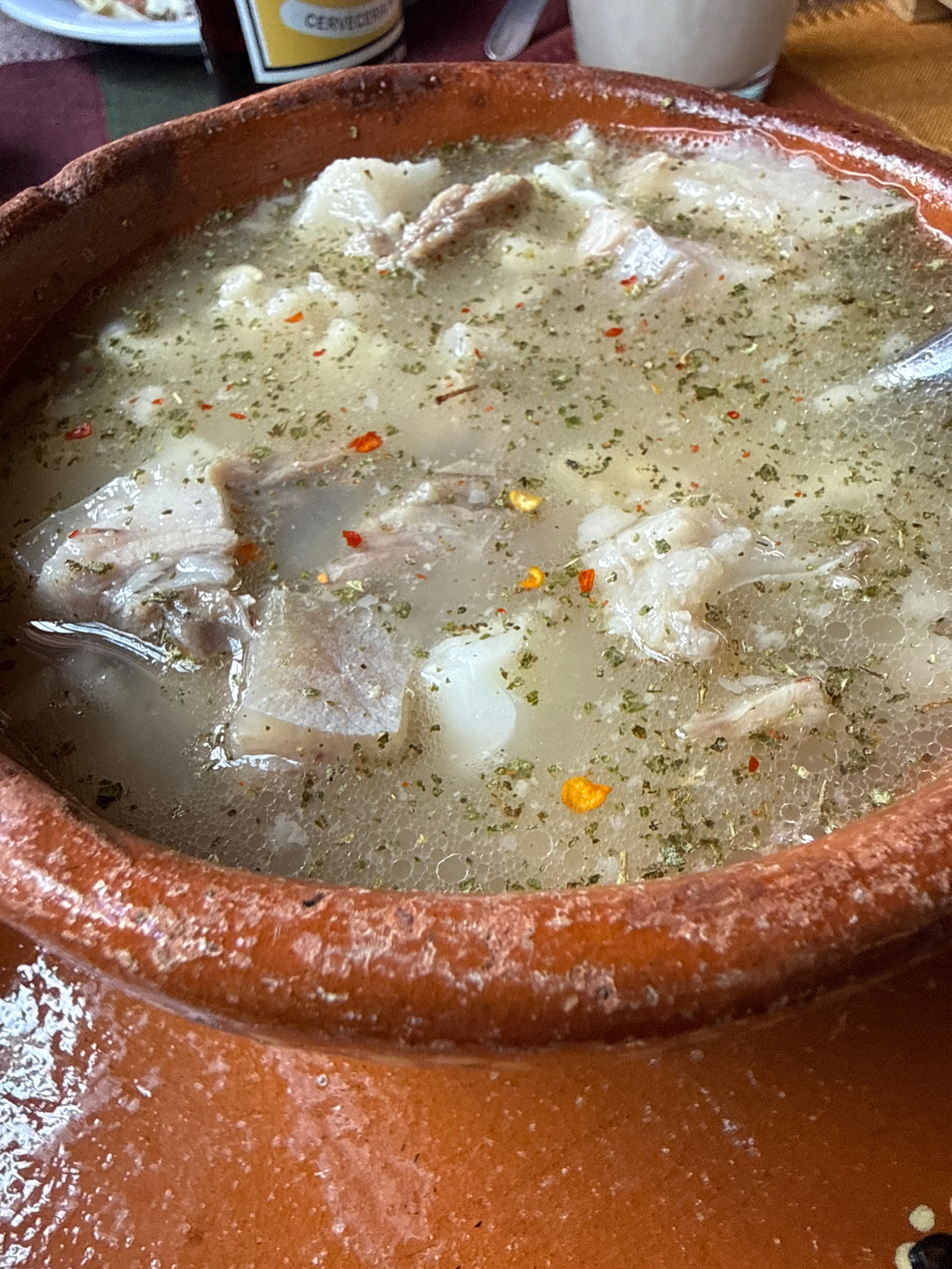A top-down, close-up shot depicts a traditional Mexican soup, likely Menudo or Pancita, served in a terracotta bowl. The soup is a cloudy, light broth with visible pieces of tripe, herbs, and spices,…read more