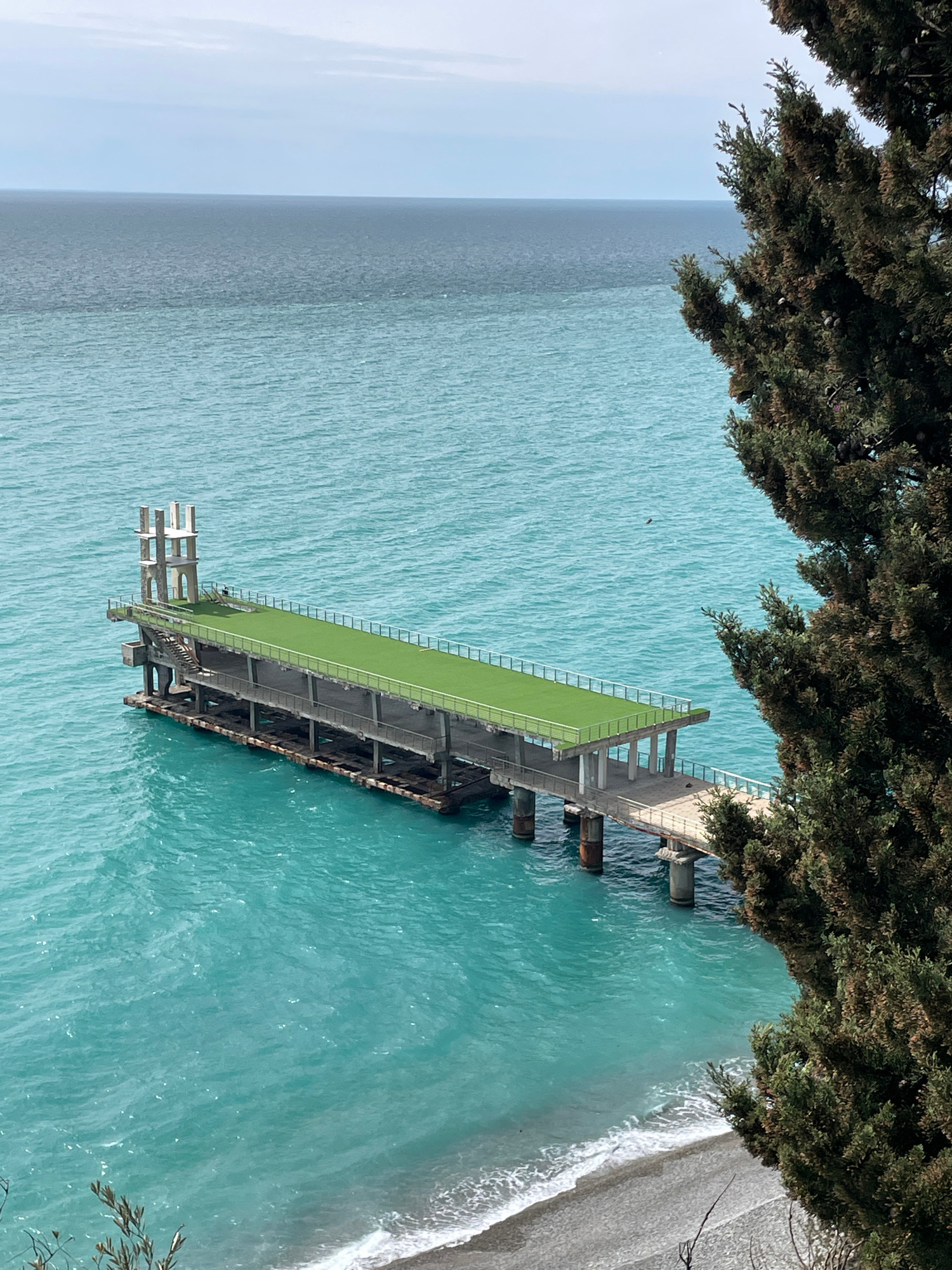 The image shows a pier extending into the turquoise waters of the Black Sea, located near Abaata, Abkhazia. The pier is made of concrete and metal, and has a green surface in the middle of the pier. T…read more