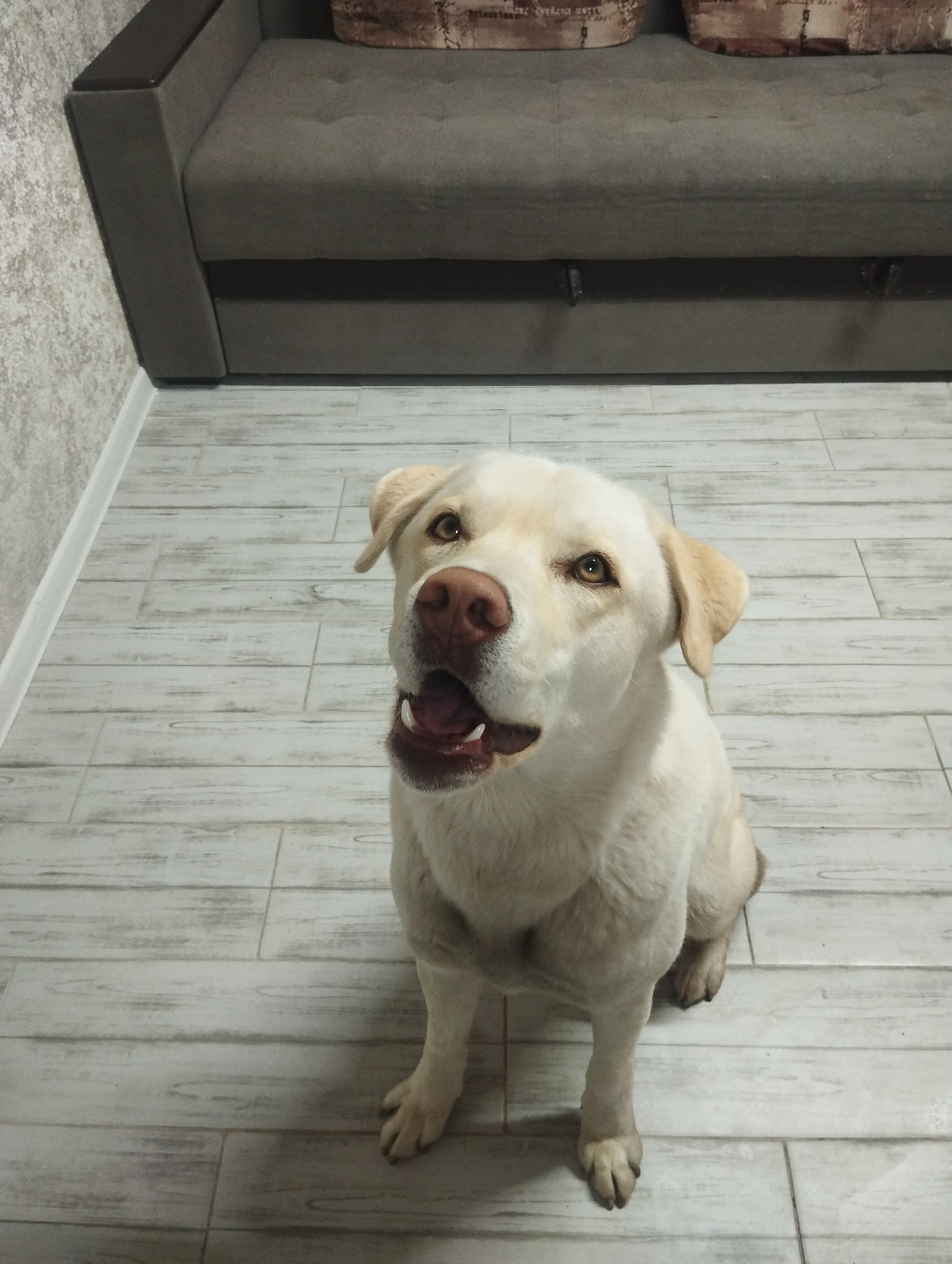 A light-colored Labrador Retriever sits on a light-colored, wood-patterned floor in front of a gray couch with decorative pillows. The dog faces the camera with its mouth slightly open. A wall with a…read more