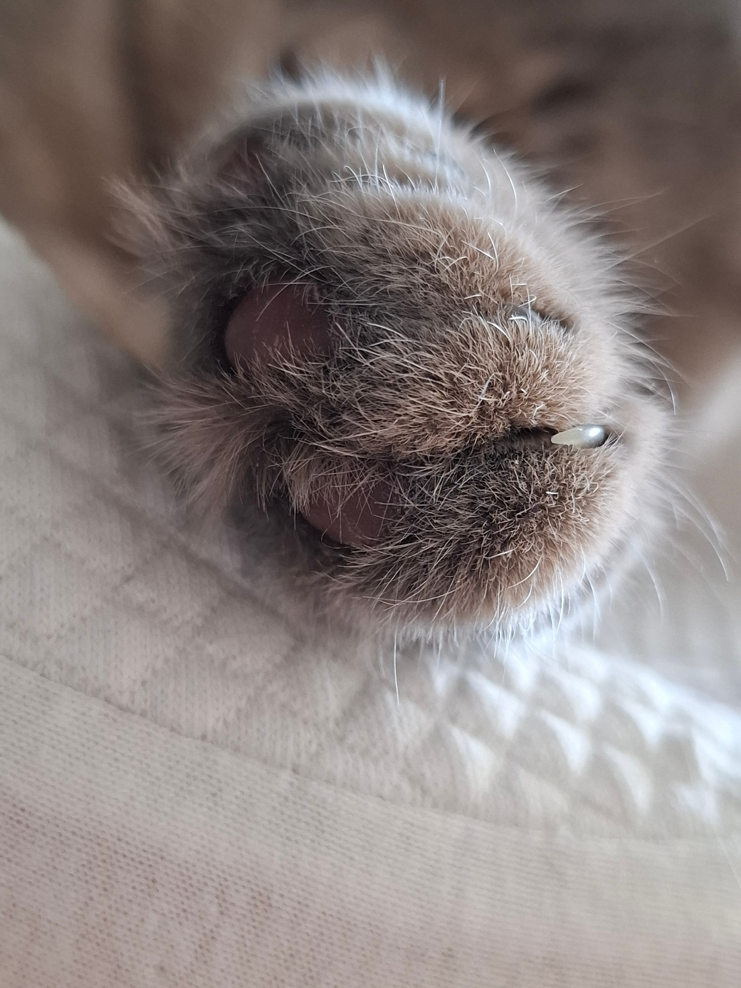 A close-up photograph displays a cat's paw with a single claw extended, likely on a soft, textured, white or light-colored surface. The paw is fluffy and grey-brown in color. There's no location infor…read more