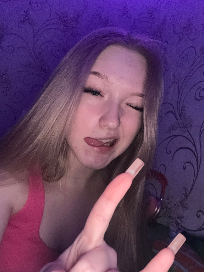 The image depicts an indoor scene, likely a residential room in the city of Saratov, Russia, illuminated by prominent purple lighting. A young individual with fair skin, long blonde hair, and visible…read more