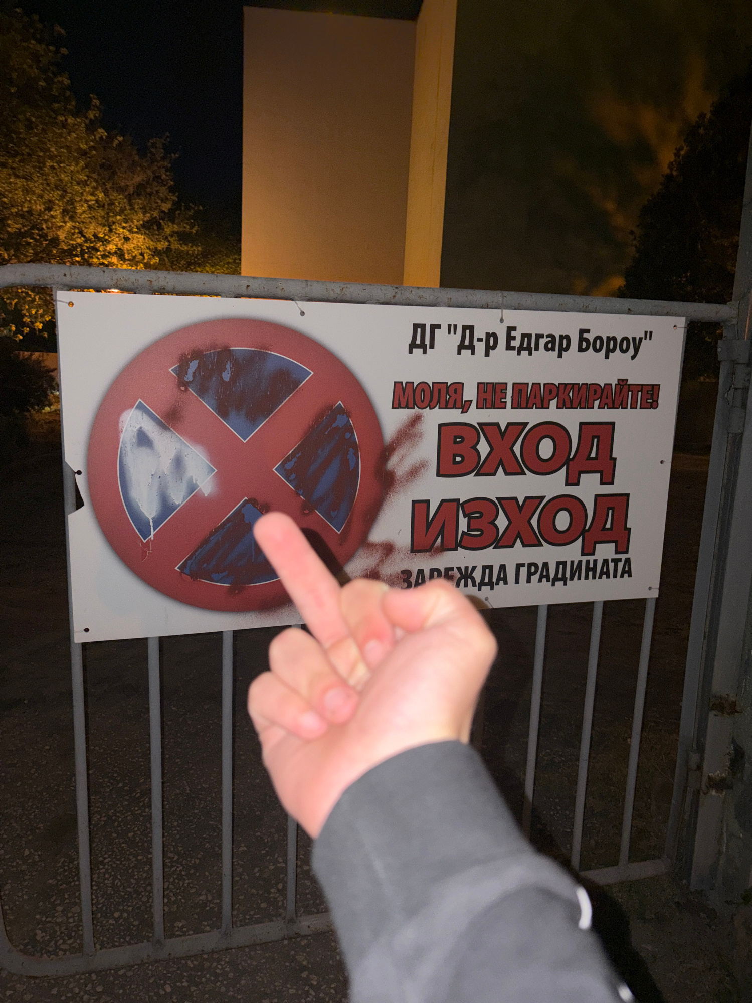 The image captures a vandalized "No Parking" sign, likely in Plovdiv, Bulgaria, though this is not explicitly stated. The sign reads "ДГ 'Д-р Едгар Бороу' МОЛЯ, НЕ ПАРКИРАЙТЕ! ВХОД ИЗХОД ЗАРЕЖДА ГРАДИ…read more