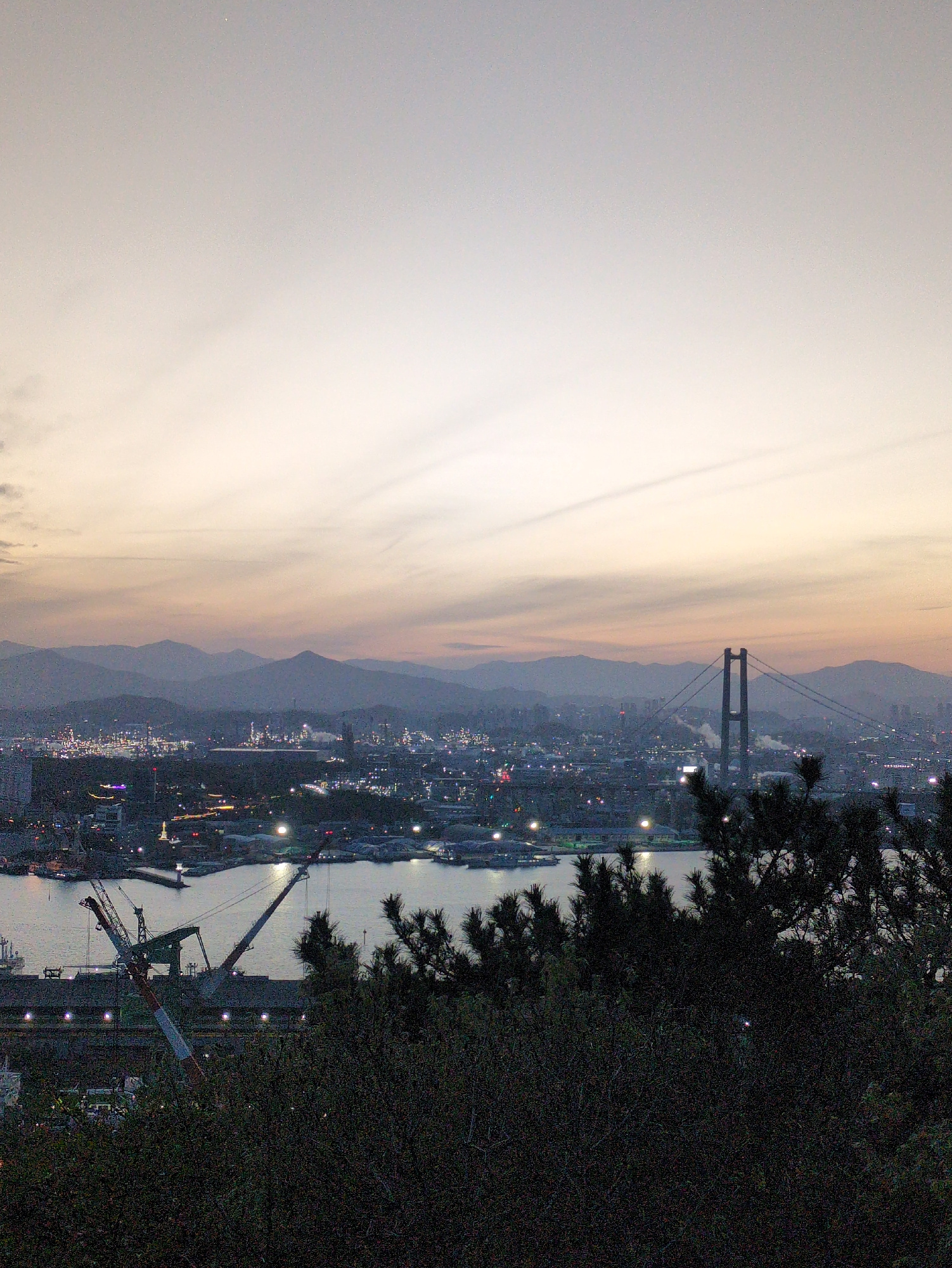 This image captures a panoramic view of an urban and industrial landscape at dusk or early night, likely in Ulsan, South Korea, from an elevated vantage point. The scene is dominated by a sprawling c…read more