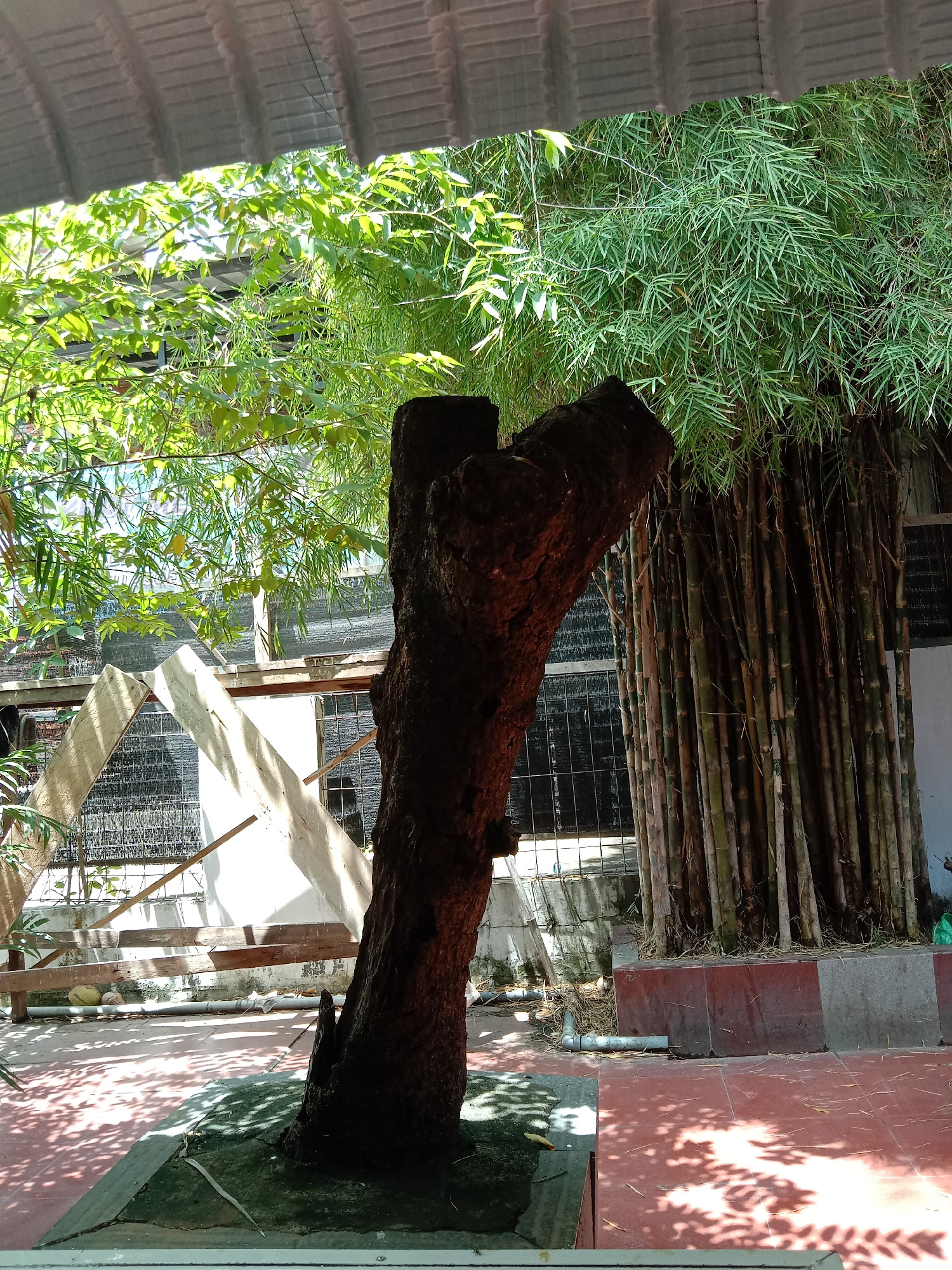 This image shows a section of outdoor space, potentially a courtyard or garden, in Lhokseumawe, Indonesia. A thick, dark-colored tree trunk stands prominently in the foreground. Behind the tree is a d…read more