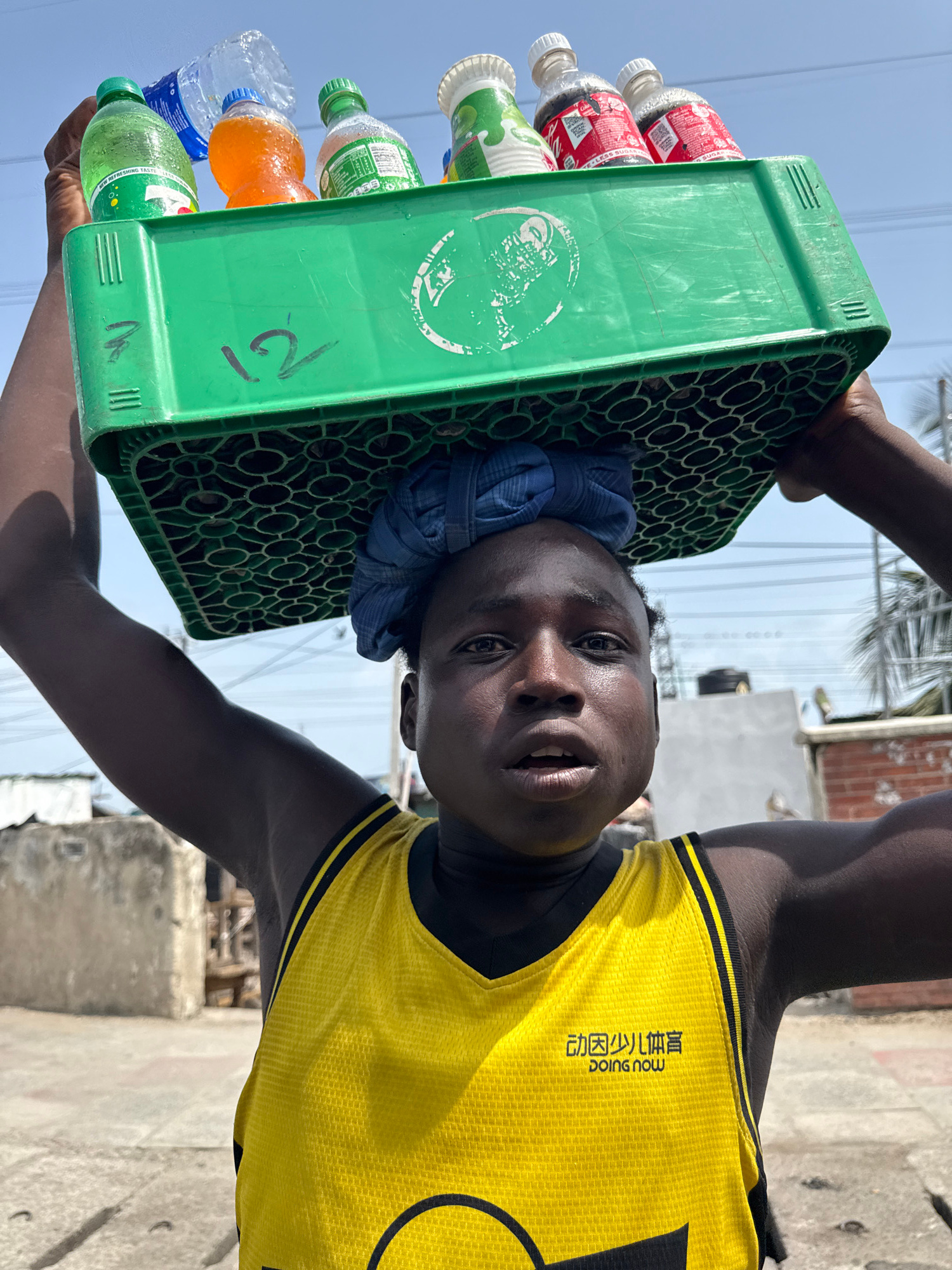 A young man stands in what appears to be a street in Igboefon, Nigeria. He is carrying a green plastic crate filled with various bottles of beverages on his head, cushioned by a blue cloth. He wears a…read more