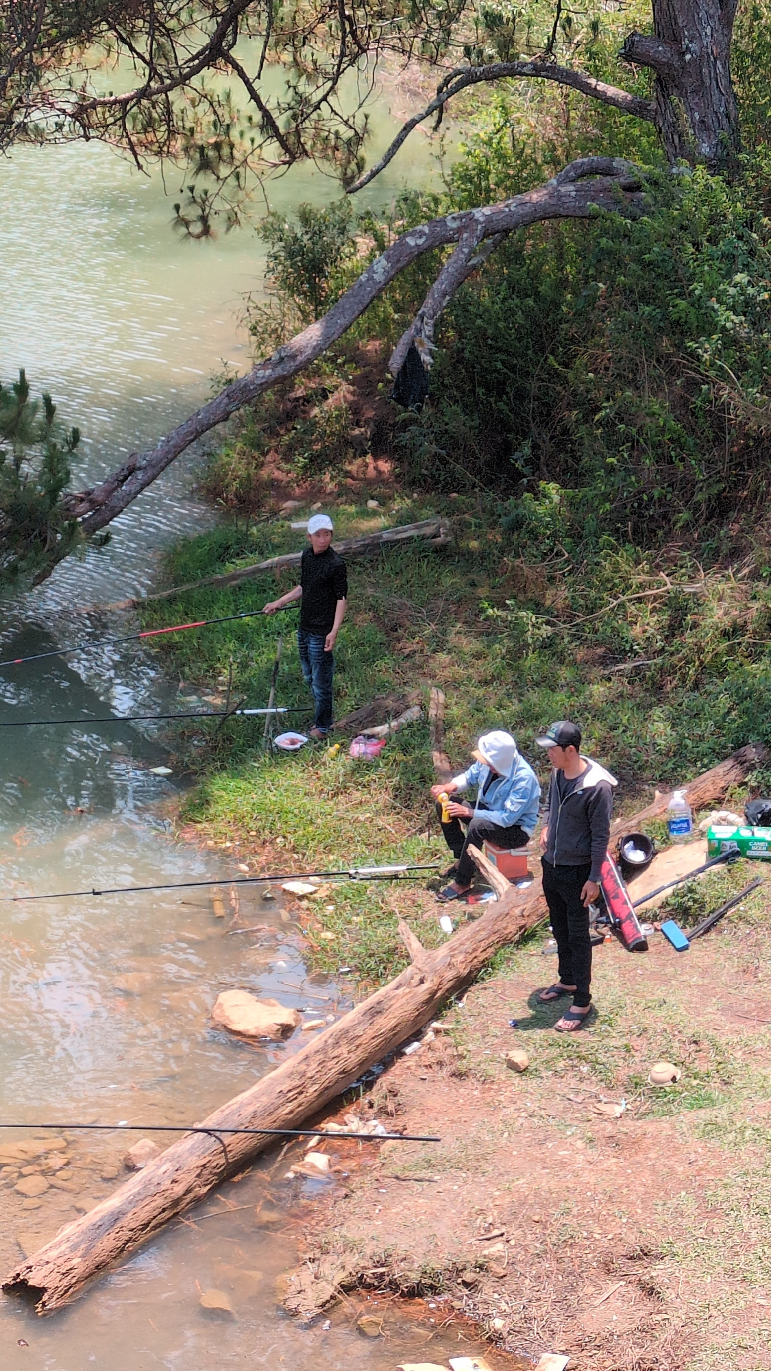 Three people are fishing by a river. The river is calm and shallow. A fallen tree lies partially in the water. Fishing rods are visible near the water's edge. The surrounding area is grassy with trees…read more