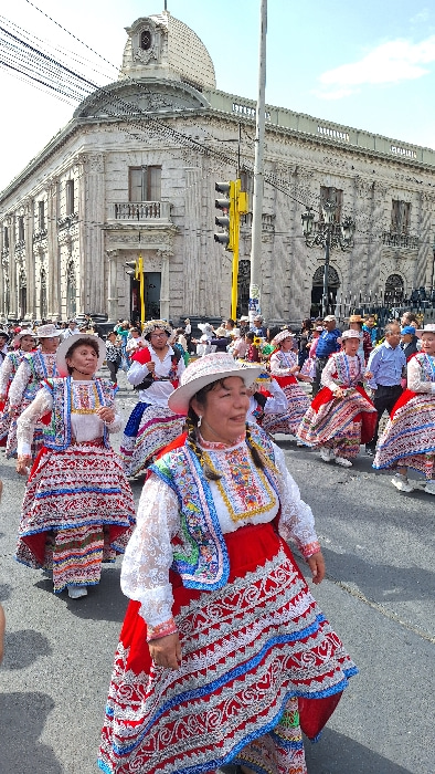 A procession of women in traditional Peruvian clothing walks along a street. They wear wide-brimmed white hats, embroidered white lace tops, red skirts with white and blue detailing. The background fe…read more