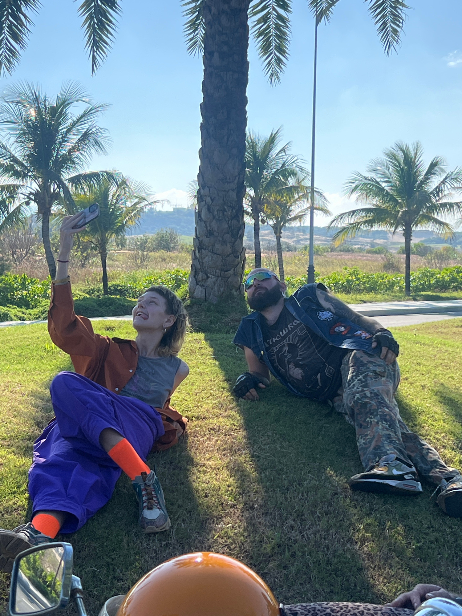 The image depicts two individuals resting on a grassy area beneath several palm trees on a clear, sunny day in Cam Ranh, Vietnam. **Subjects:** 1. **Left Individual:** A female-presenting person with short, light-colored hair, wearing an unbuttoned orange-brown jacket over a grey t-shirt, loose purple pants, bright orange socks, and athletic shoes. She is lying on her left side, propped up on her left elbow, with her head tilted back and tongue extended playfully, looking upwards. Her right arm is raised, holding a light-colored smartphone (possibly an iPhone with visible camera lenses) angled as if taking a selfie or recording. 2. **Right Individual:** A male-presenting person with a beard, wearing multi-colored mirrored sunglasses, a dark t-shirt with a graphic print (partially visible Cyrillic text), a denim vest adorned with patches (including a spade poker chip and a skull), camouflage cargo pants, athletic shoes, and fingerless gloves. He is lying on his left side, propped up on his left elbow, looking towards the left foreground. Tattoos are visible on his left arm. **Objects and Environment:** * The immediate foreground features a chrome motorcycle rearview mirror reflecting a road and green foliage, and an orange motorcycle helmet positioned below the mirror, partially obscuring a leopard-print fabric. * Both individuals are positioned on a well-maintained patch of green grass. * Behind them are multiple tall palm trees with visible trunks and fronds, casting shadows on the grass. * A paved path or road is visible behind the grass area, with a single light pole standing between two palm trees. * In the background, rolling hills or distant terrain covered in lighter-colored vegetation extend towards the horizon, with what appear to be distant structures or communication towers on the highest ridge. * The sky is clear and light blue, indicative of bright daylight. | Open Wire