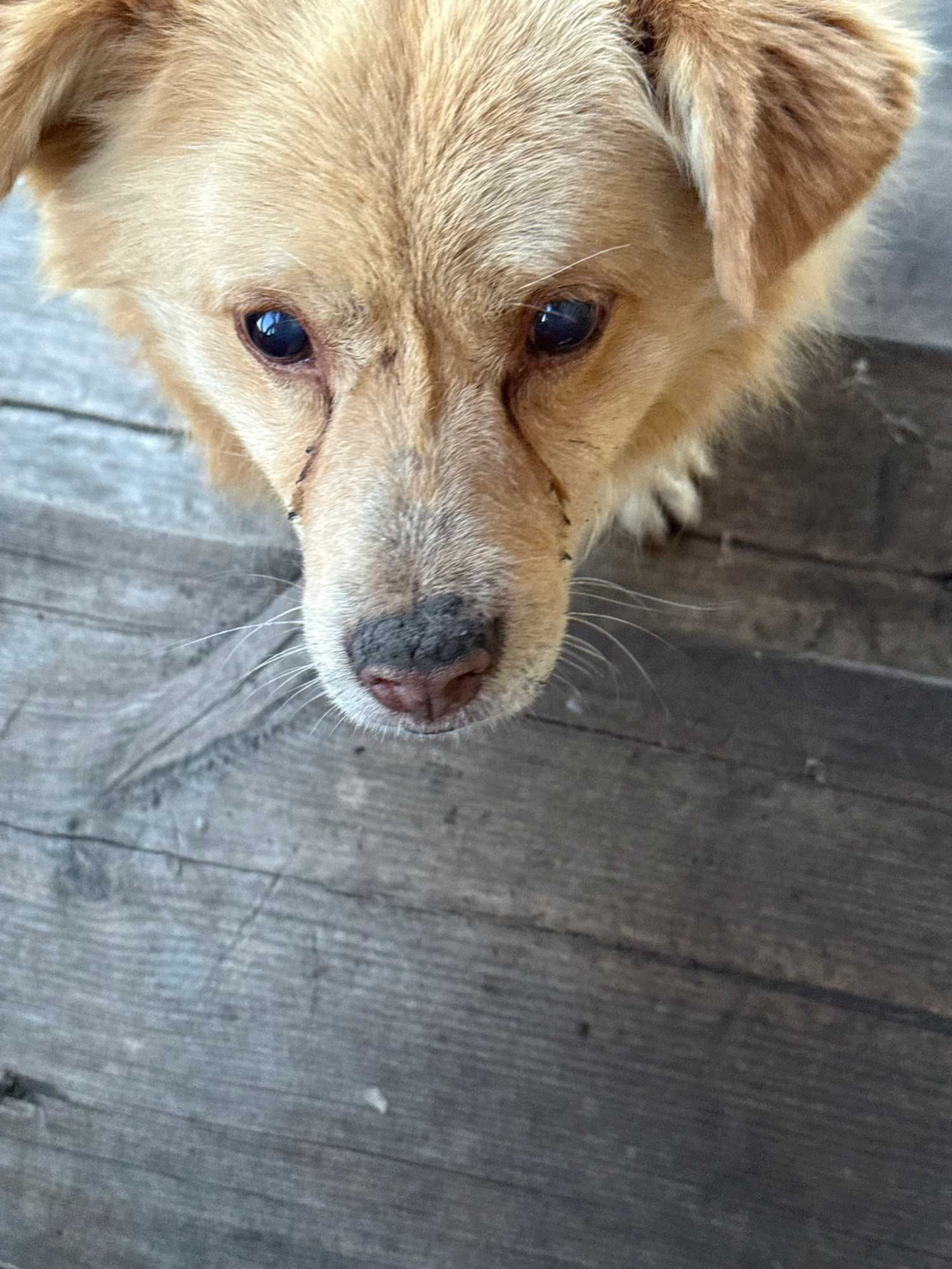 A close-up shot of a light-brown dog with a black nose is pictured from above. The dog is situated on what appears to be an aged, grey wood surface with pronounced grain patterns. The image may have b…read more
