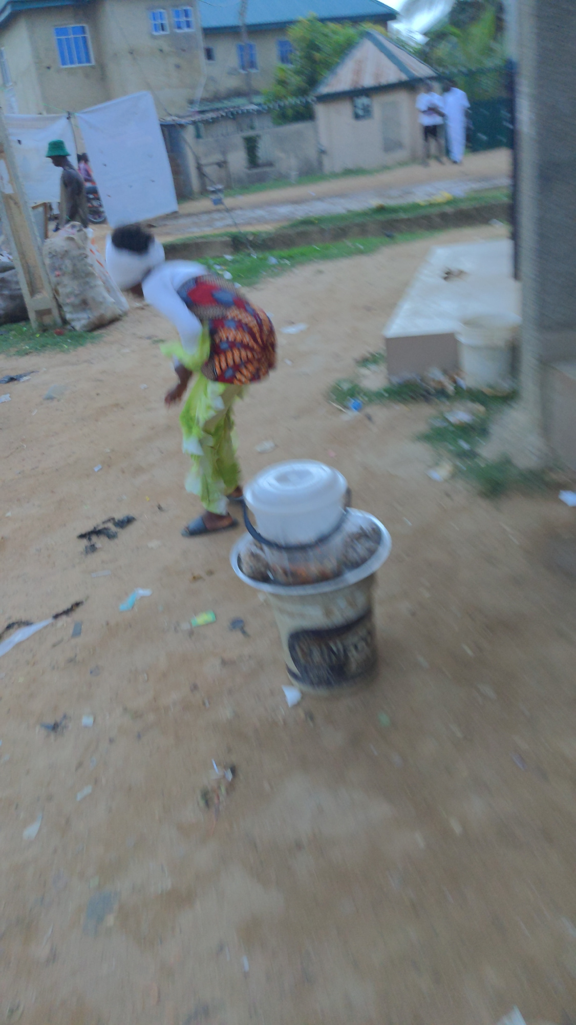 The scene depicts a woman carrying a load on her head, walking on a sandy surface in Ado, Nigeria. She is wearing a patterned headscarf, a white top, and a green wrap around her waist. The load on her…read more