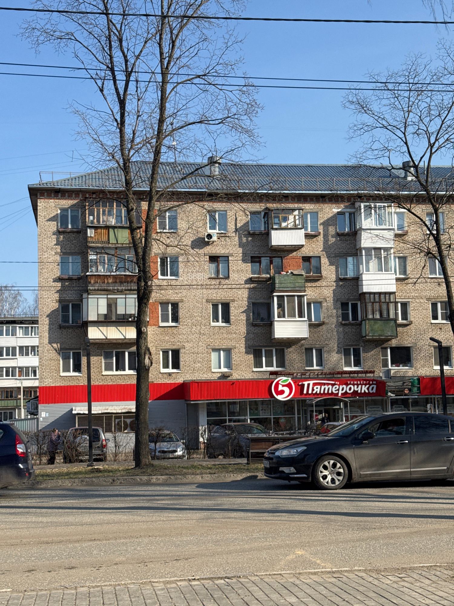 The image shows a multi-story brick building with numerous windows and enclosed balconies. A bare tree branch stretches across the left side of the frame, obscuring parts of the building and the clear…read more