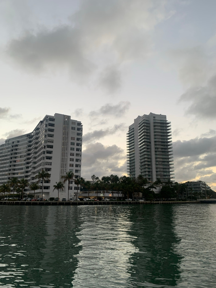 The image presents an eye-level, wide shot captured from a body of water in South Beach, Miami Beach, Florida, United States of America. The scene depicts a twilight or overcast daytime condition. Tw…read more
