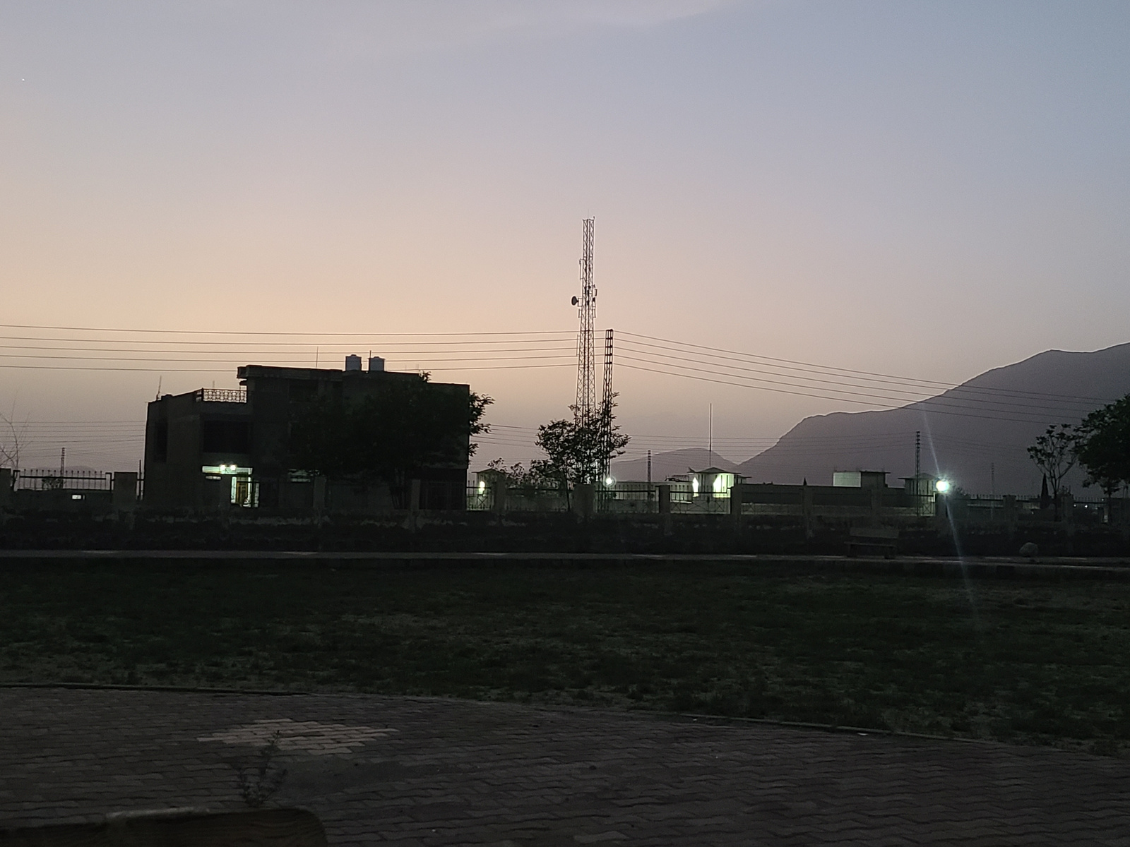 The image depicts an urban or semi-urban landscape in Quetta, Pakistan, during twilight, characterized by dim ambient light and visible artificial illumination. The sky exhibits a gradient from pale o…read more