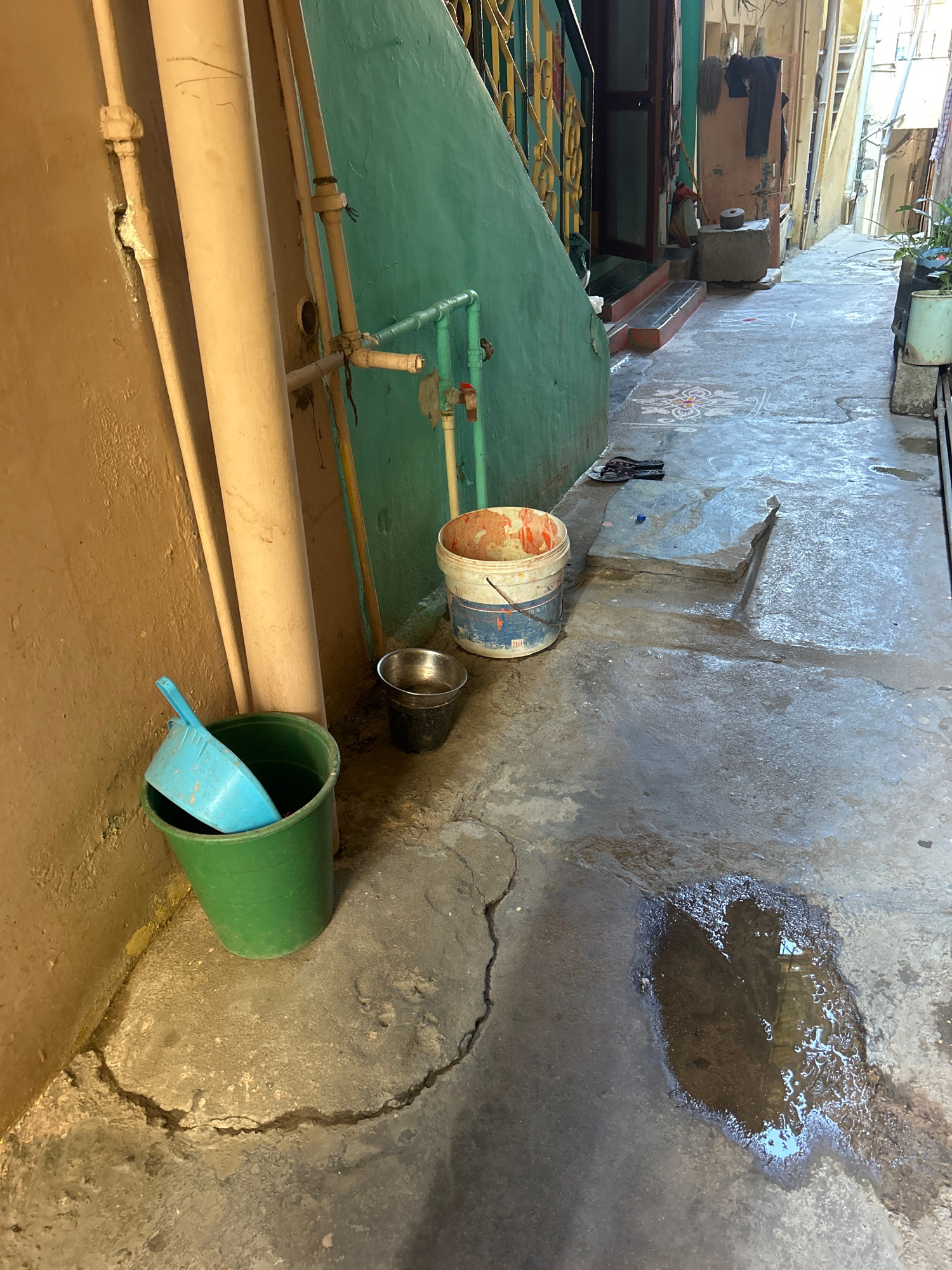 The image depicts an exterior corridor or alley in Puttaparthi, India. The flooring is concrete, with visible cracks and a puddle of water. Adjacent to a light green wall are pipes and a brown wall be…read more