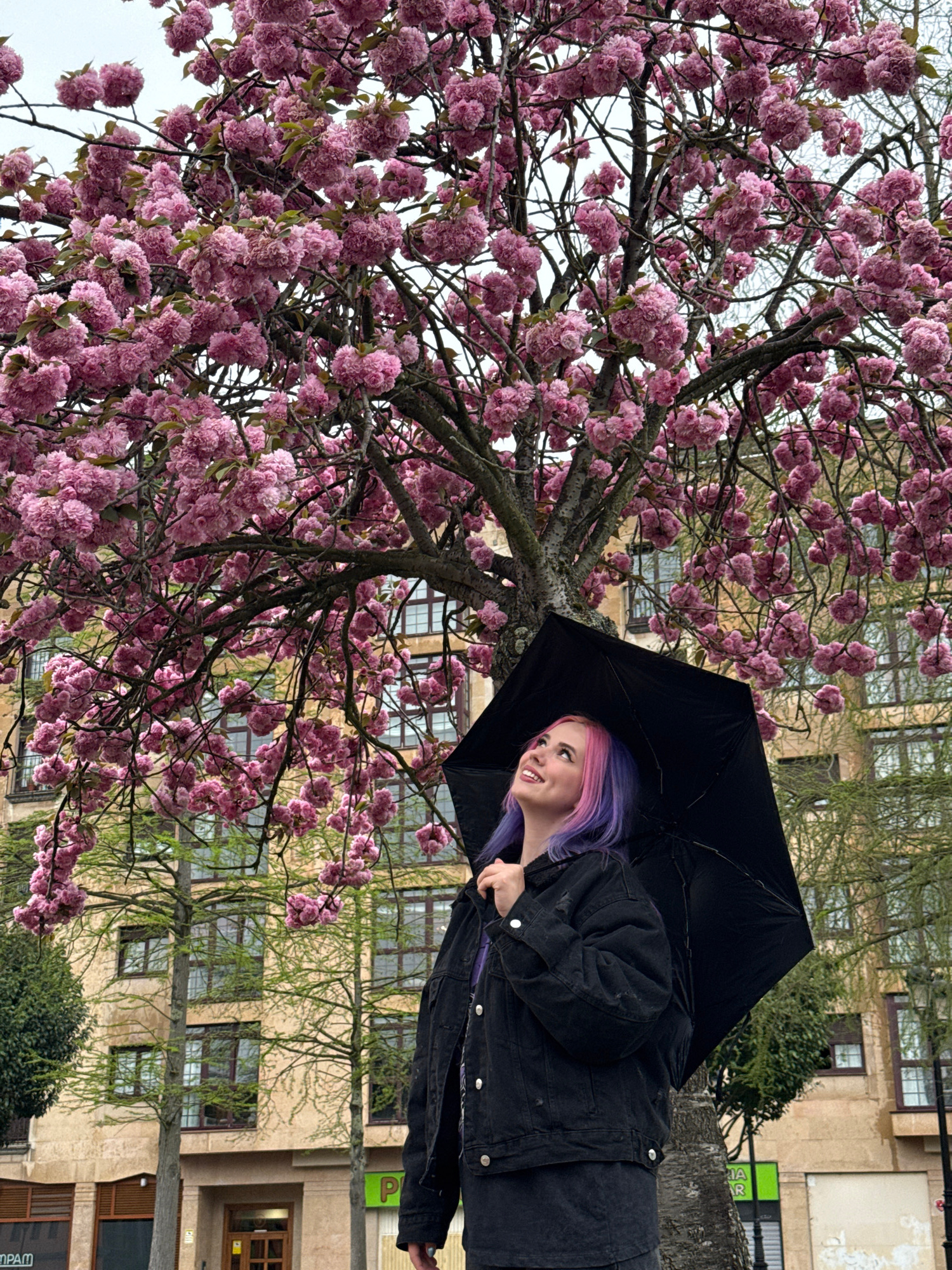 A young woman with purple and pink hair holds a black umbrella while standing under a blossoming tree with pink flowers. The tree is in the foreground and takes up most of the left side of the image.…read more