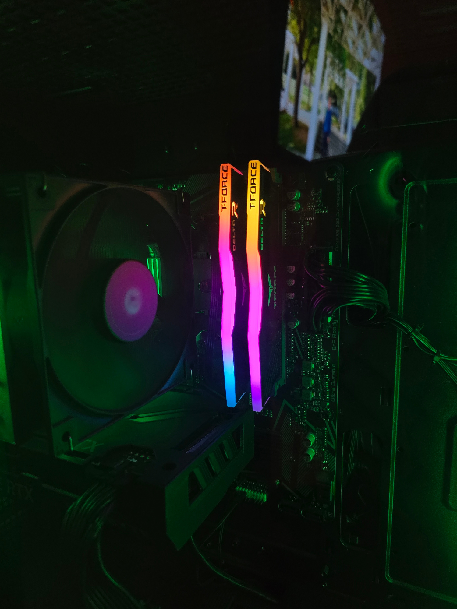 The image shows the interior of a computer case, focusing on the components related to cooling and memory. Two sticks of T-FORCE Delta RAM are prominently displayed, illuminated with RGB lighting sho…read more