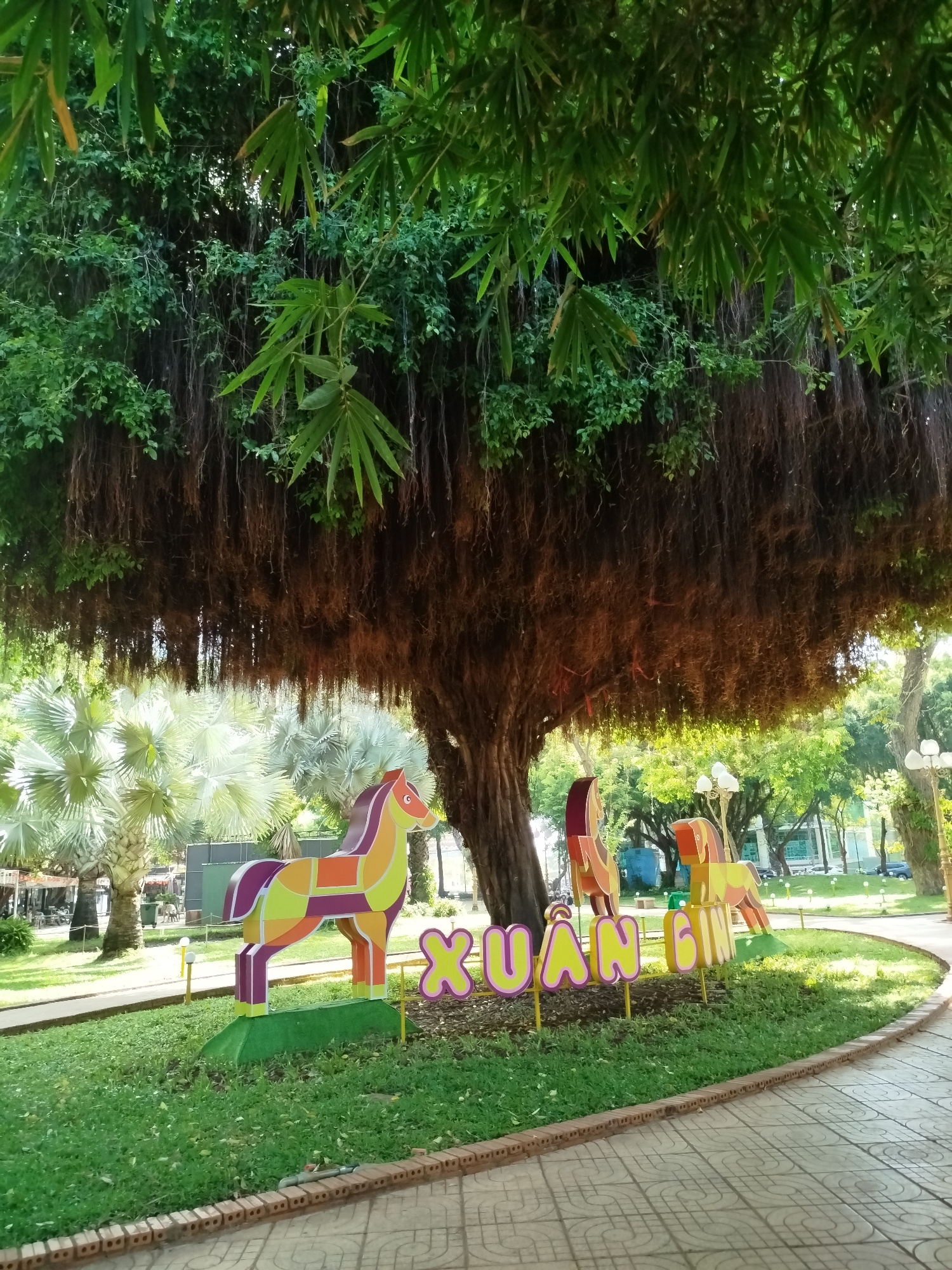 The image shows a park scene in Ho Chi Minh City, Vietnam, featuring a large banyan tree with numerous aerial roots hanging down. Beneath the tree are colorful cutout horse figures and the word "XUAN,…read more