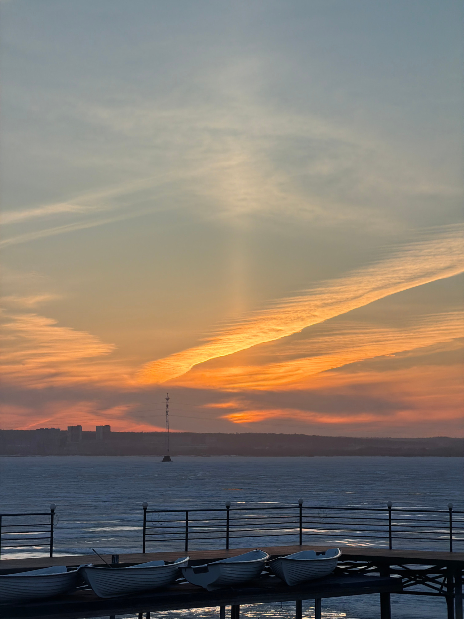 The image shows a sunset view from a pier in Izhevsk, Russia, overlooking the Izhevsk Reservoir. The sky is filled with orange and yellow hues caused by the setting sun and cloud formations. A linear…read more