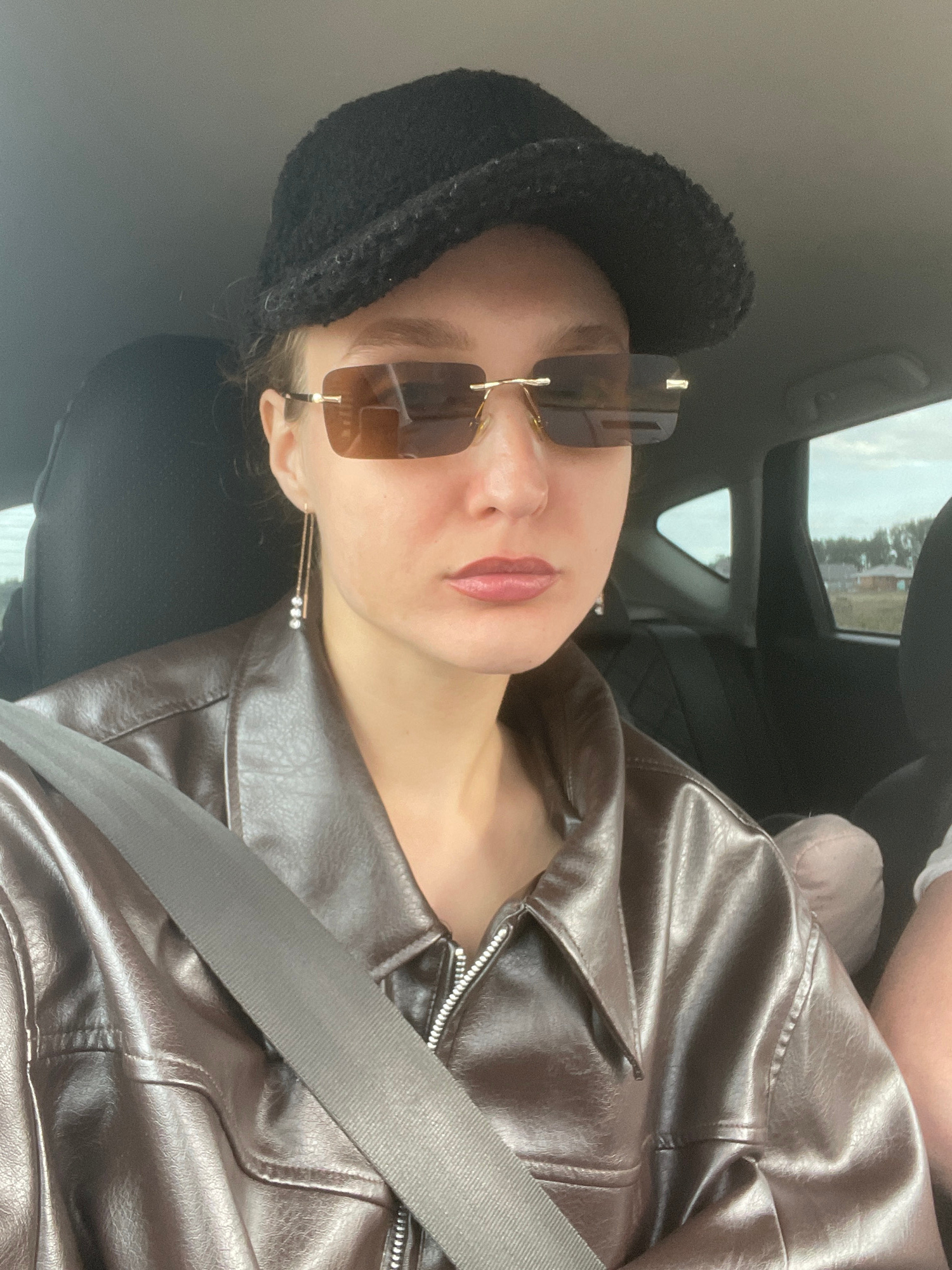 The image, oriented on its side, captures a person seated in the passenger seat of a car, looking directly at the viewer. The setting is identified as Подшивалово, Russia. The subject is a young adul…read more