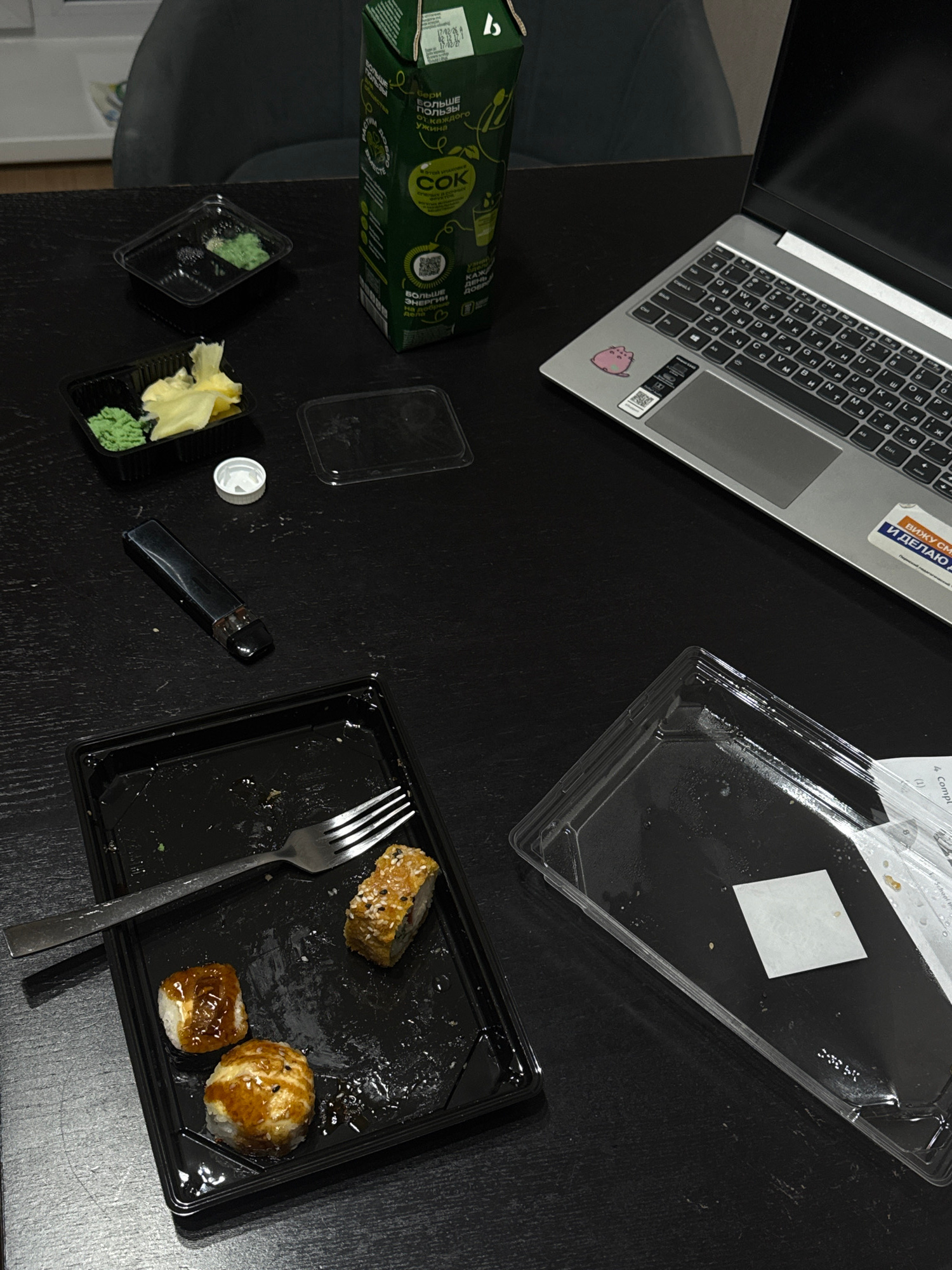 A high-angle shot depicts a cluttered, dark surface. A laptop is partially visible in the upper left corner. Adjacent to it is a translucent, rectangular container, possibly used for takeout food. A g…read more
