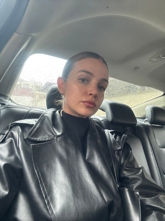The image depicts a female subject seated in the rear passenger compartment of a vehicle in an unknown city, Unknown. The subject, a woman appearing to be in her mid-20s to early 30s, has light brown…read more