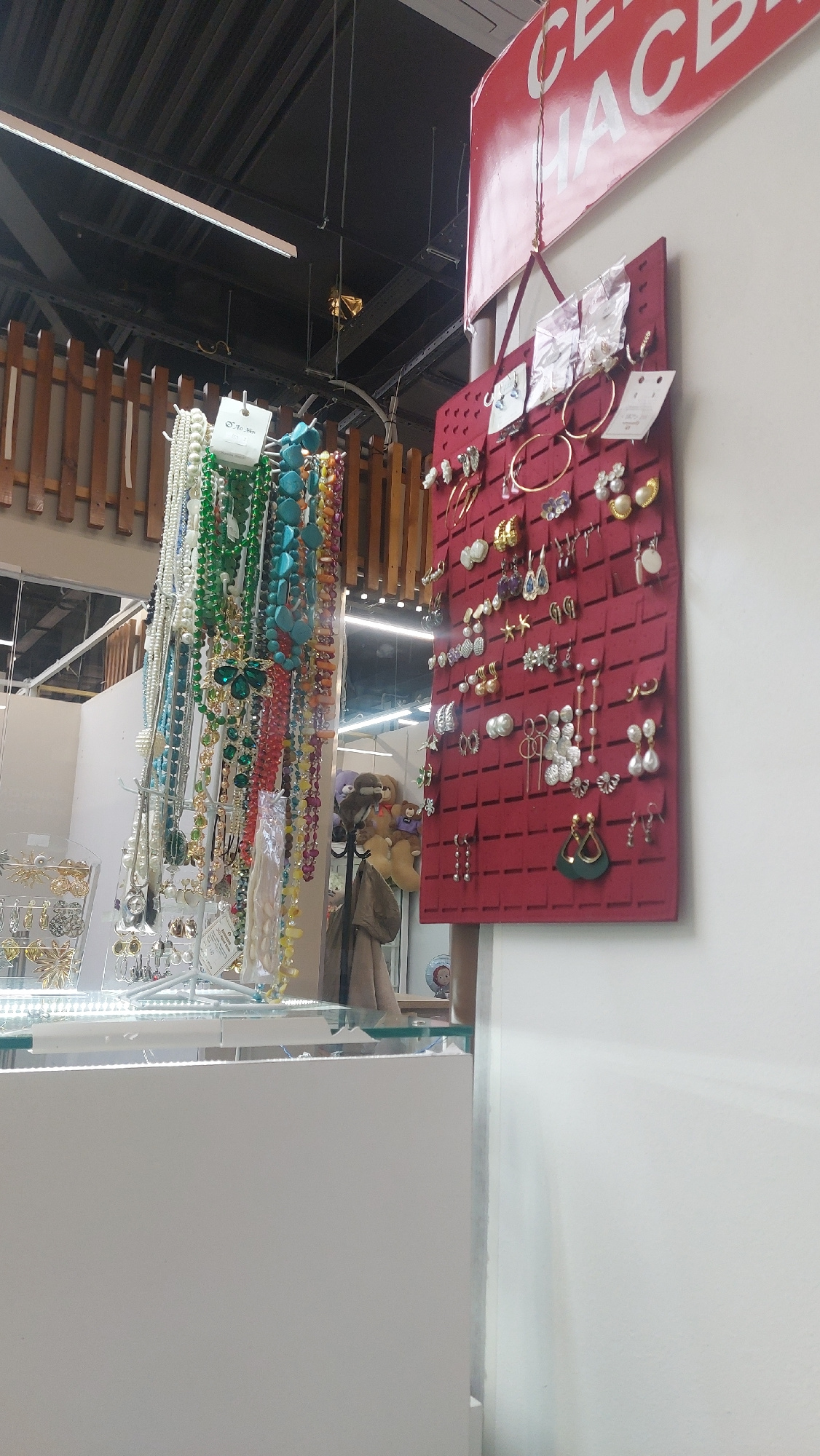 The image shows a store display in Novosibirsk, Russia. The display features a red fabric board with various earrings and rings attached. Below, there are multiple strands of beaded necklaces in vario…read more