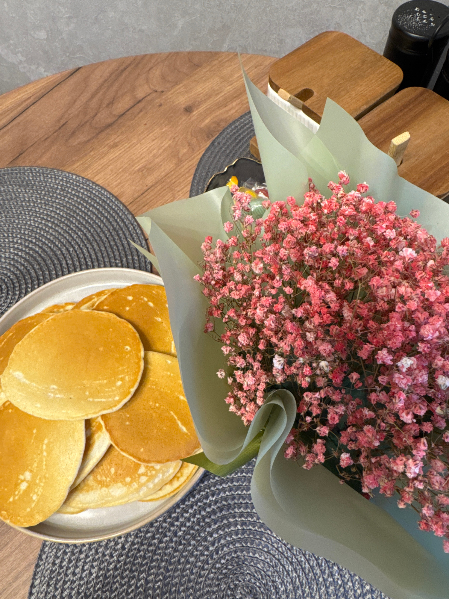 A high-angle shot displays a scene on a wooden table in Yakhroma, Russia. A bouquet of pink baby's breath flowers, wrapped in light green paper, dominates the center of the frame. To the right of the…read more