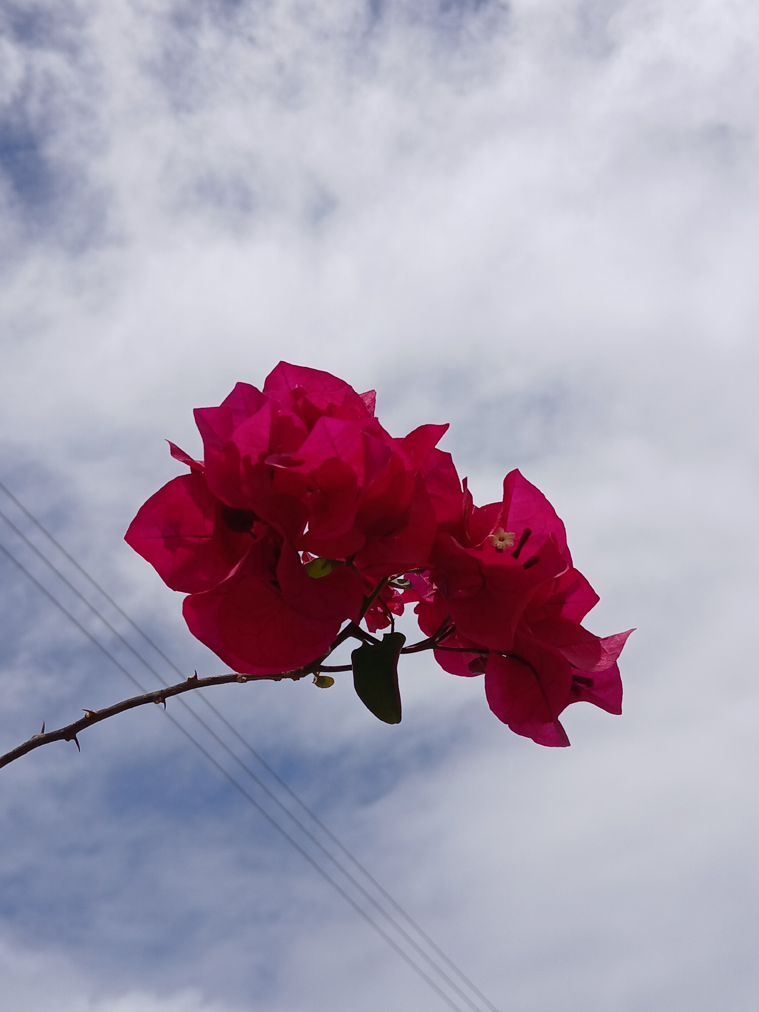 The image depicts a cluster of bright pink bougainvillea flowers in full bloom, set against a backdrop of a cloudy sky. The flowers are the main subject, exhibiting vibrant color and intricate petal s…read more