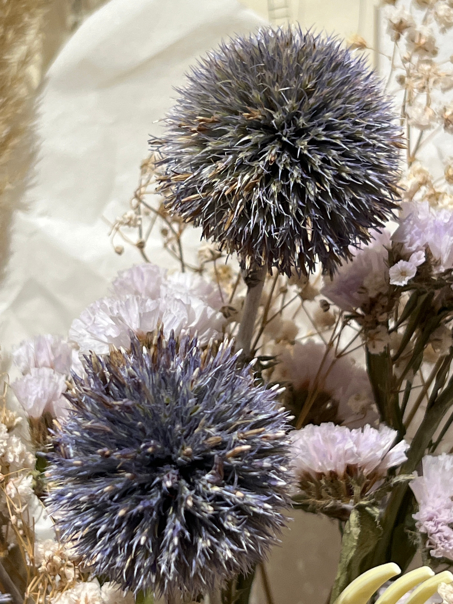 The image presents a close-up view of a bouquet of dried flowers. Two prominent thistle-like spherical blooms, exhibiting a muted blue-gray hue, dominate the foreground. These blooms feature numerous…read more
