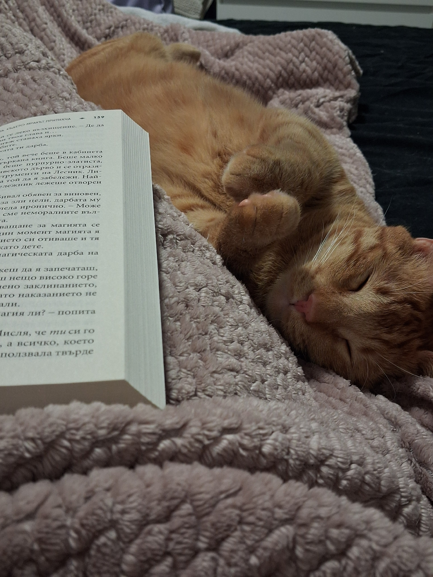 A ginger cat is sleeping on a soft, textured, blush-colored blanket. The cat is curled up with its paws tucked in. Beneath the cat and blanket is a book, open to a page of text in Bulgarian. The book…read more